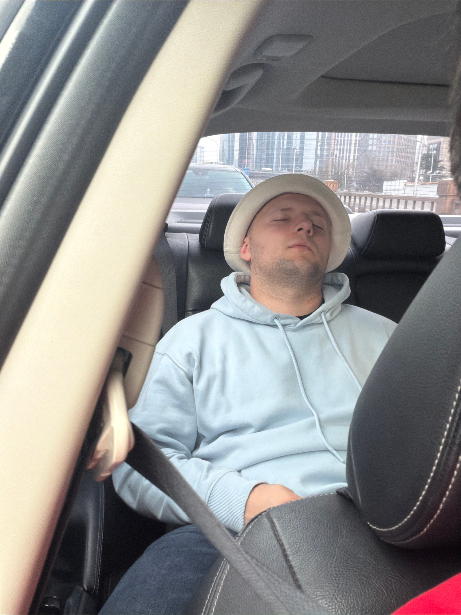 A man wearing a bucket hat and a light blue hooded sweatshirt is asleep in a car seat. He is wearing a seatbelt. Outside the car window, there are tall buildings, suggesting an urban environment. The…read more