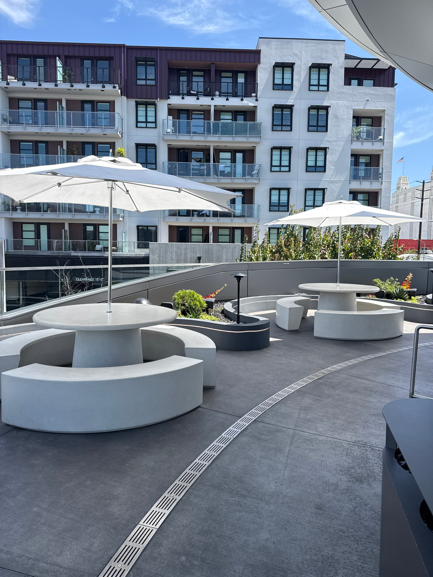 This outdoor shot shows a series of modern, curved concrete benches and tables situated on a gray, textured surface, likely a patio or rooftop area. The benches are arranged in semi-circular shapes, w…read more