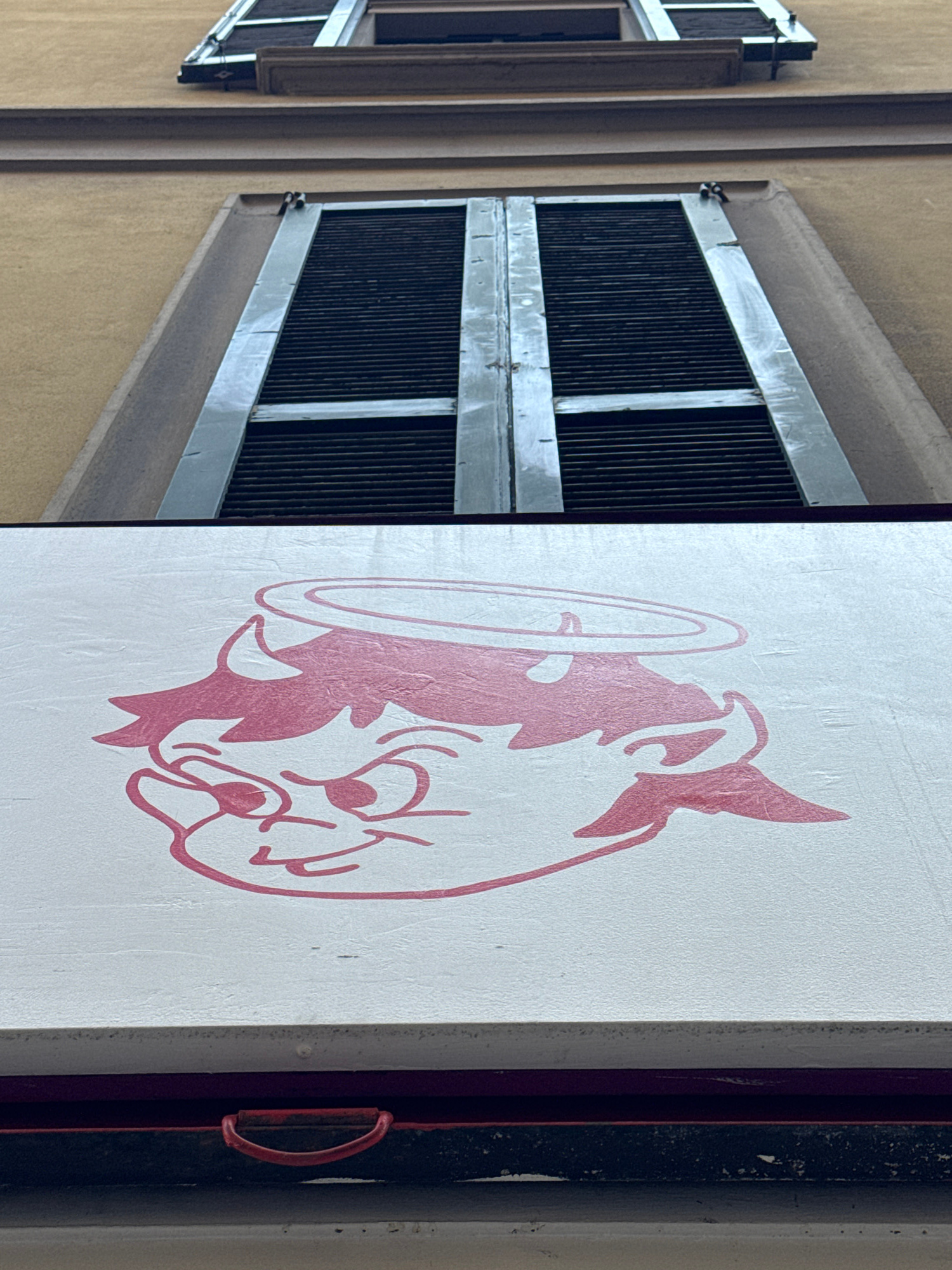 The image presents a juxtaposition of architectural elements and a painted logo. On the left, a section of a building facade is visible, featuring two windows with metal grates and light-colored frami…read more