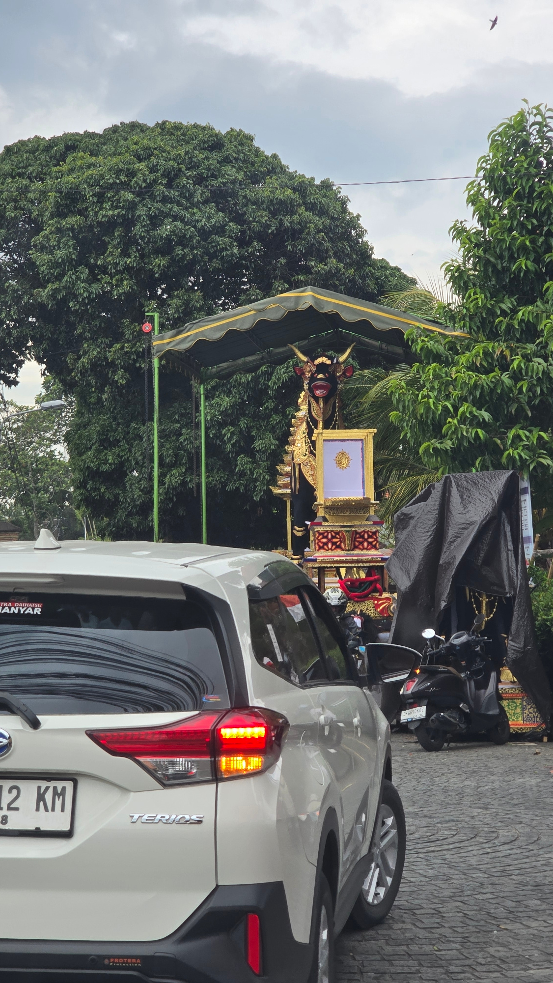 This image captures a street scene, likely in Ubud District, Indonesia, featuring elements of a traditional Balinese Hindu cremation ceremony. In the foreground, the rear of a white SUV is prominently…read more