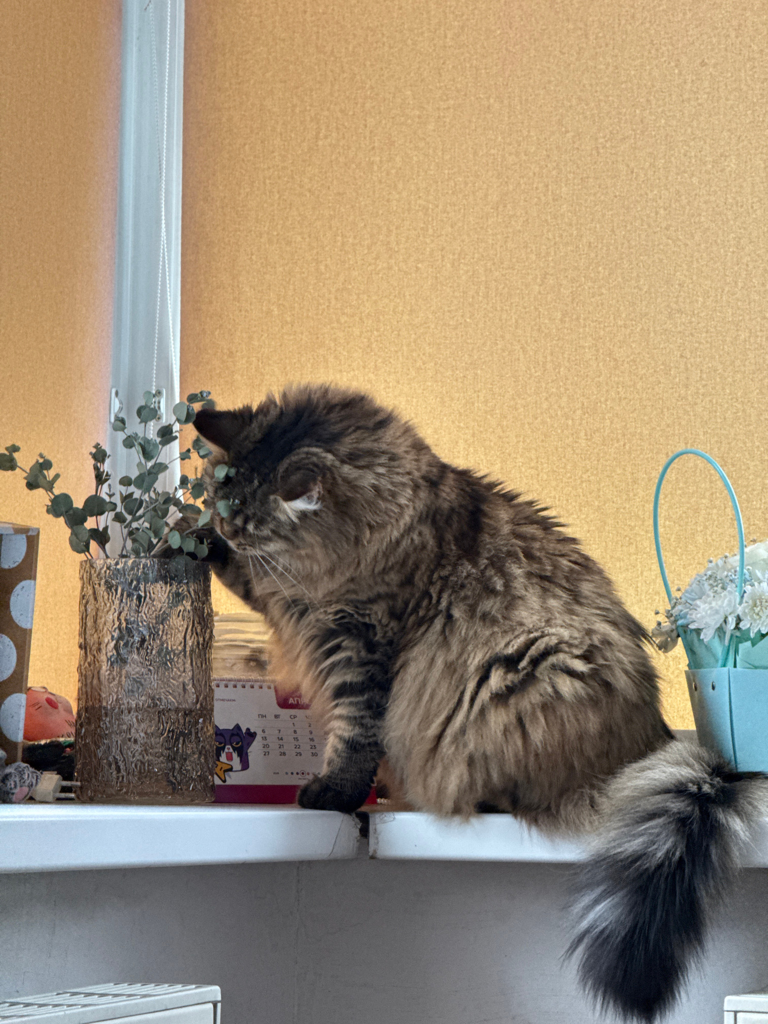 A long-haired tabby cat perches on a shelf near a window in an indoor setting. The cat is investigating a vase of eucalyptus branches. Above the cat, a small blue pail containing white flowers hangs f…read more