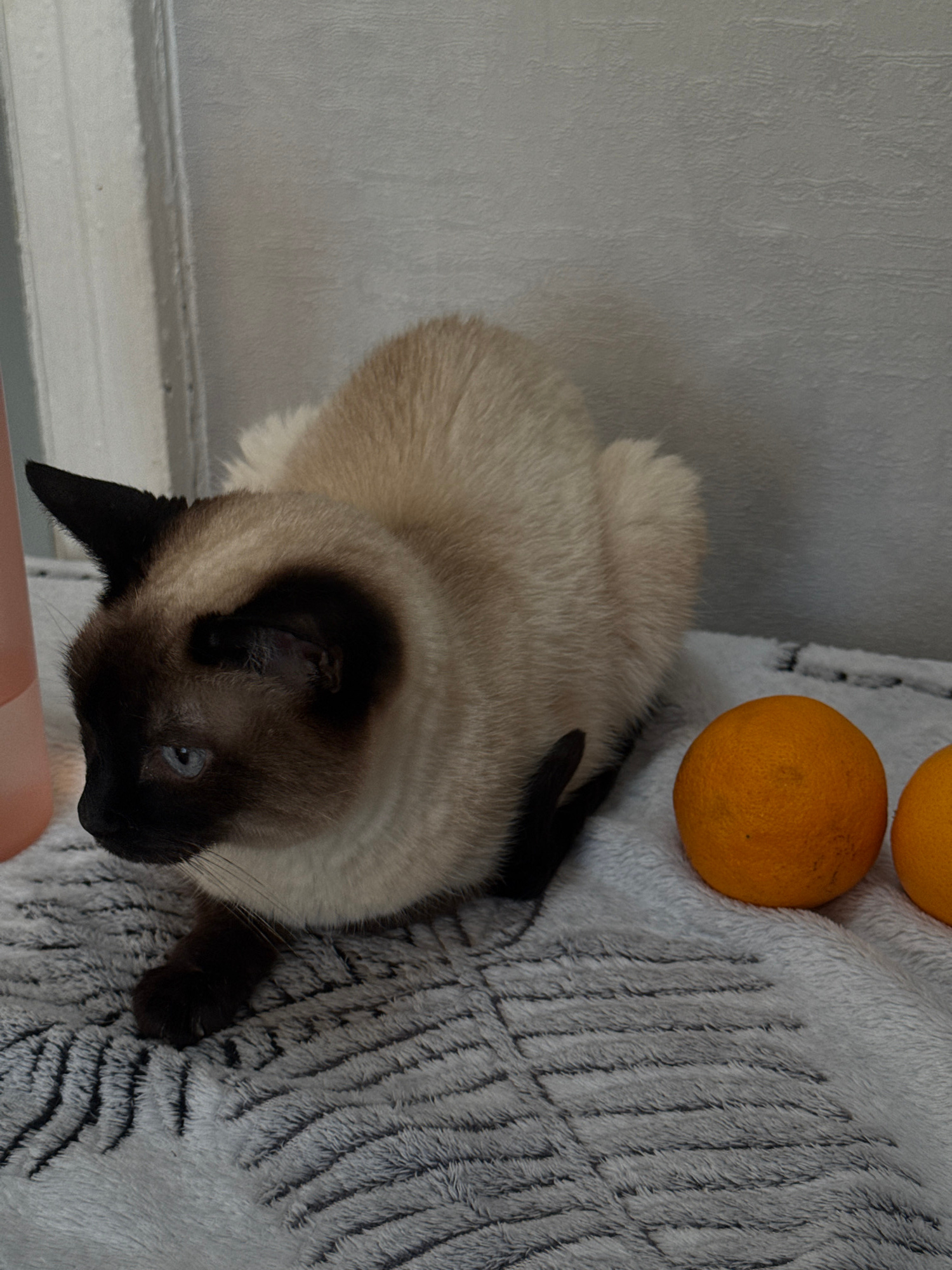 A tan and brown Siamese cat is lying on a gray, patterned blanket. Two oranges sit on the blanket near the cat. The location is not evident in the image.