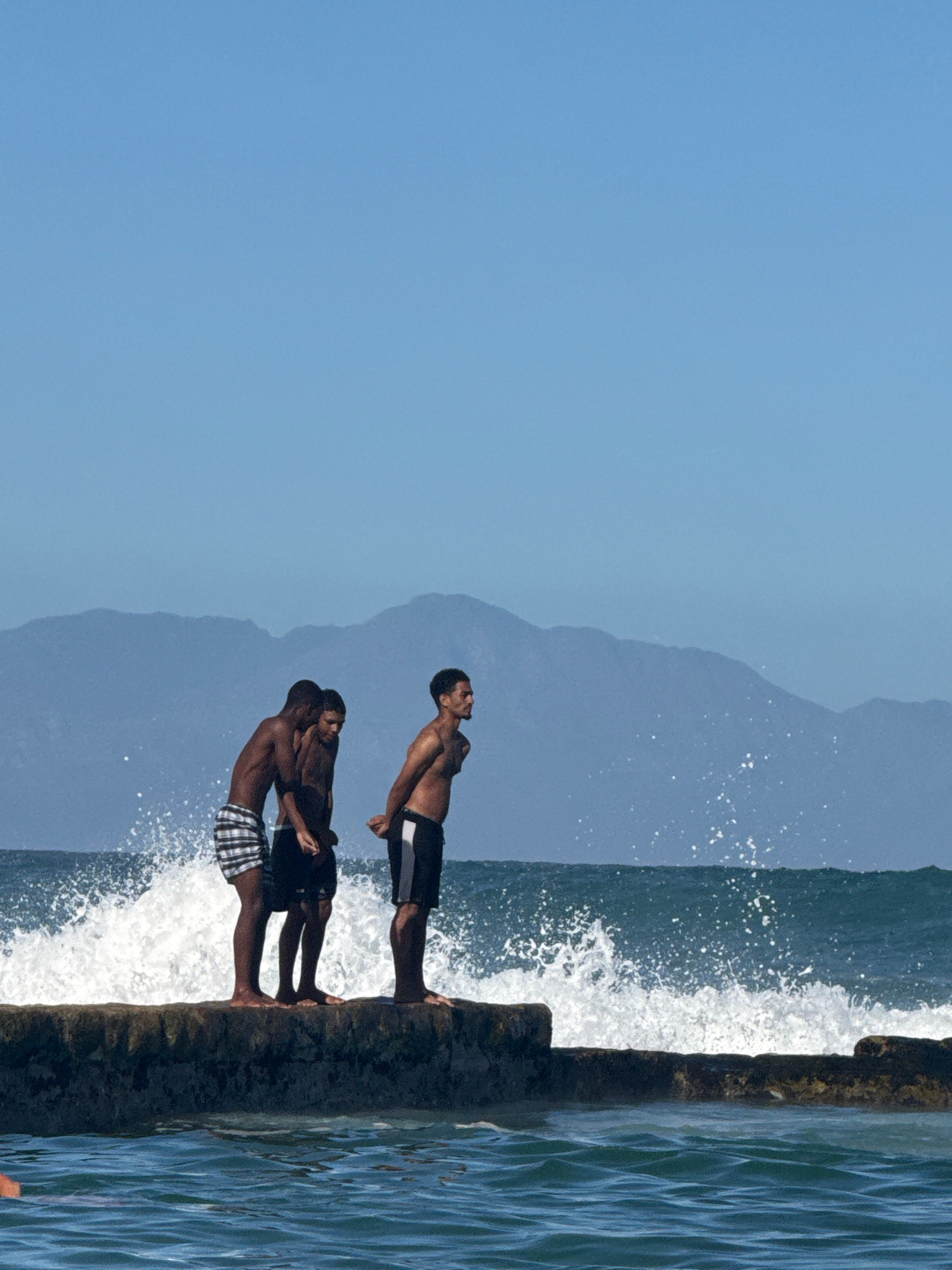 Three men stand on a dark stone structure along the coastline with a blue ocean to the right. A wave is crashing on the structure. Behind the men, are blurred mountains and a light blue sky. The image…read more