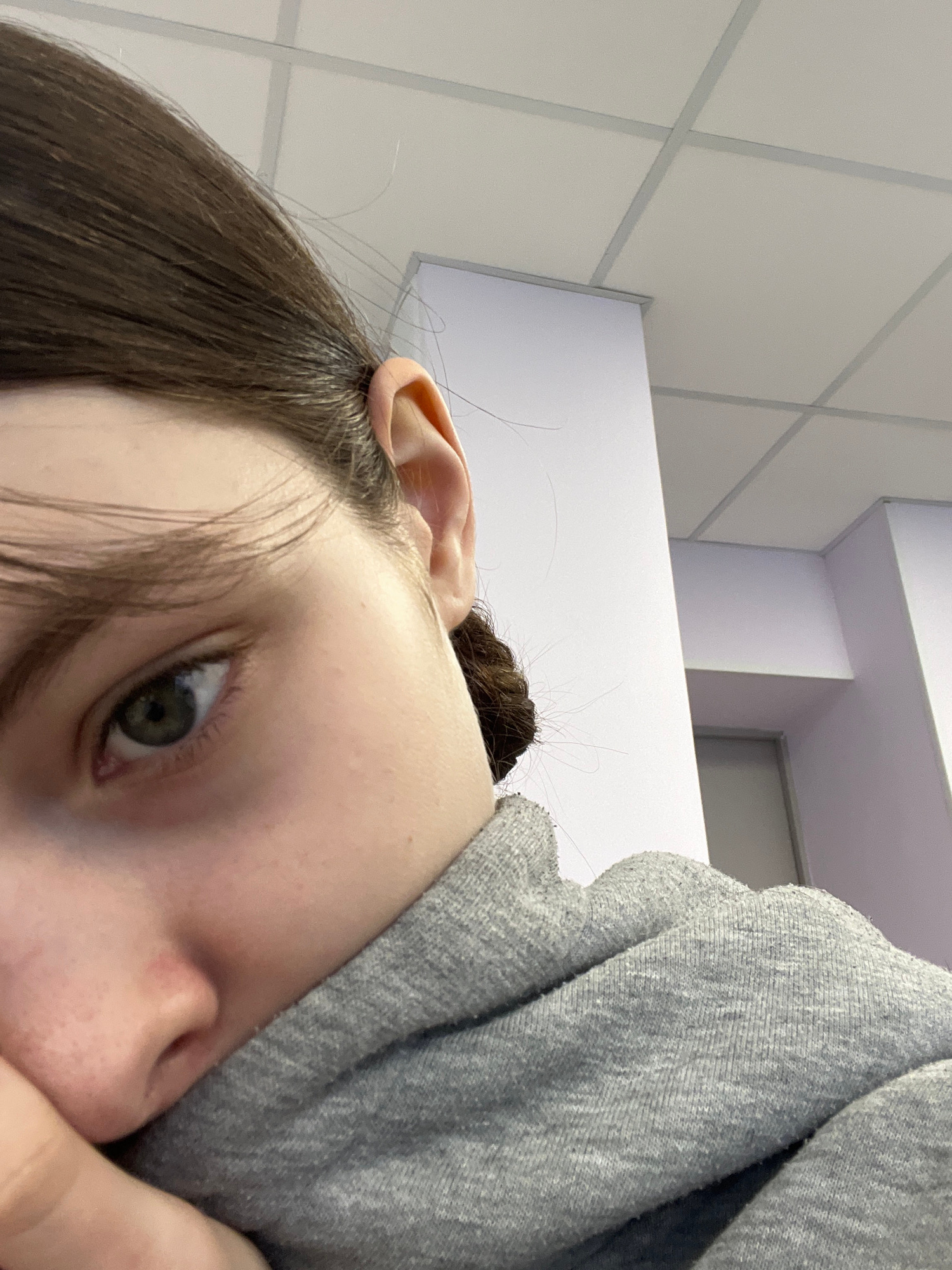 A close-up, angled view of a person's face and upper body. The person has fair skin, dark brown hair, and a green eye is visible. The person is partially obscured by a gray, textured fabric garment. T…read more
