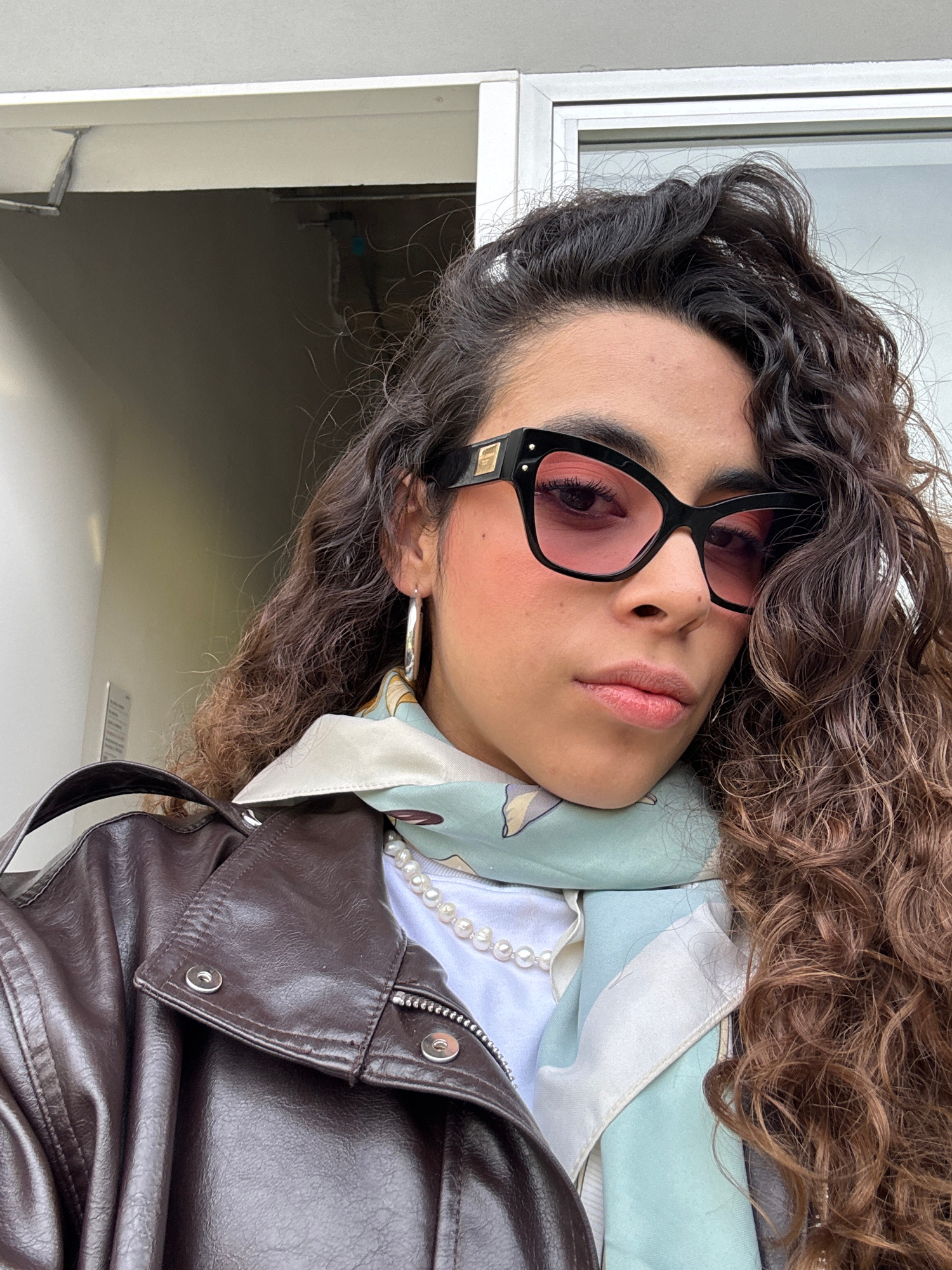 A woman with brown curly hair is wearing black-rimmed sunglasses with rose-colored lenses, a pearl necklace, and a brown leather jacket. A light blue scarf is visible around her neck. The image appear…read more