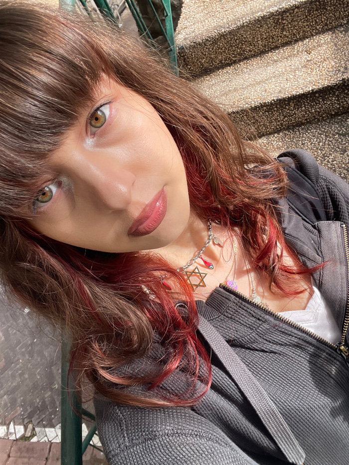 A female individual is depicted in a close-up, high-angle photograph taken outdoors in Raanana, Israel. She possesses brown, shoulder-length hair with reddish-pink highlights and bangs, and her eyes a…read more