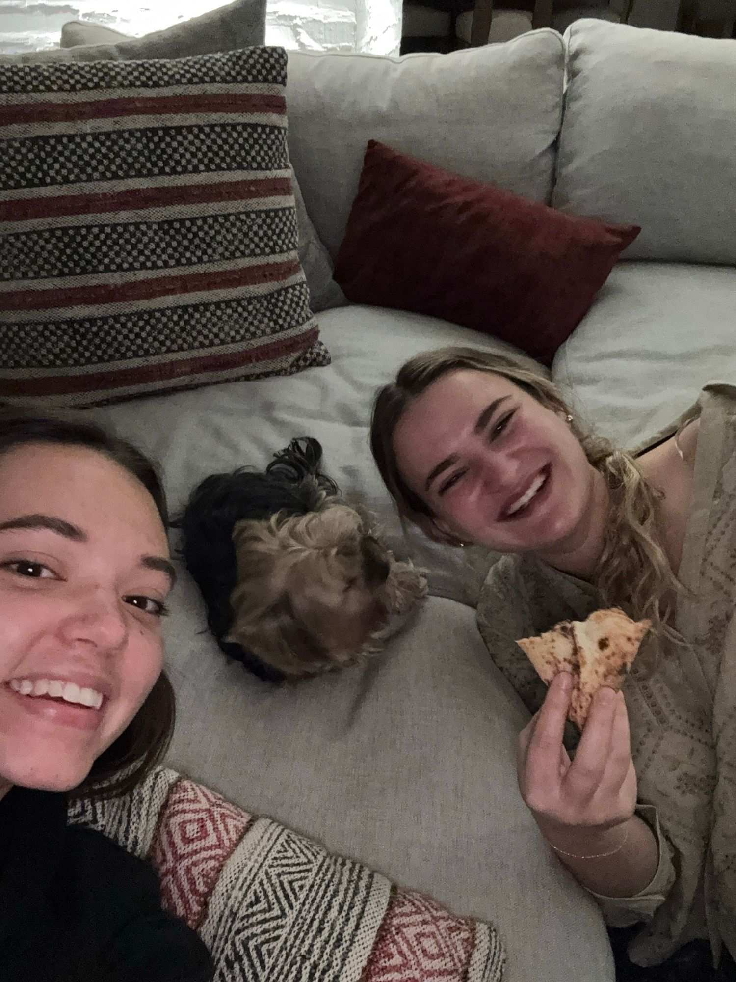 Two women and a small dog are reclining on a light gray couch with several pillows. One woman is blonde and holding a piece of food. The other woman has dark hair and is smiling. The couch has a red r…read more