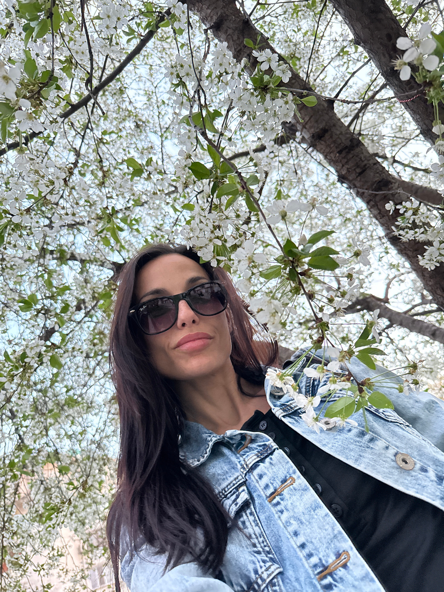 A woman with sunglasses and a denim jacket is taking a selfie under a tree with white blossoms. The location is Pleven, Bulgaria.