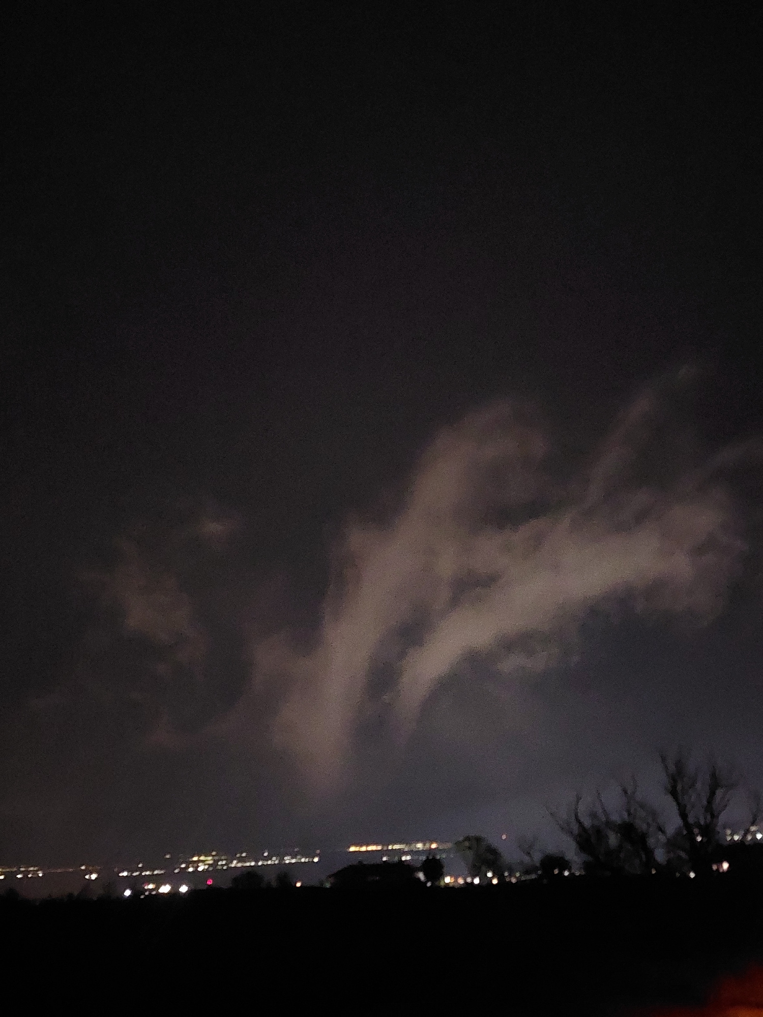 A photograph taken at night depicts a dark sky with scattered clouds. The right edge of the frame shows a silhouette of trees and distant city lights. Given the location of Asenovgrad, Bulgaria, it isβ¦read more