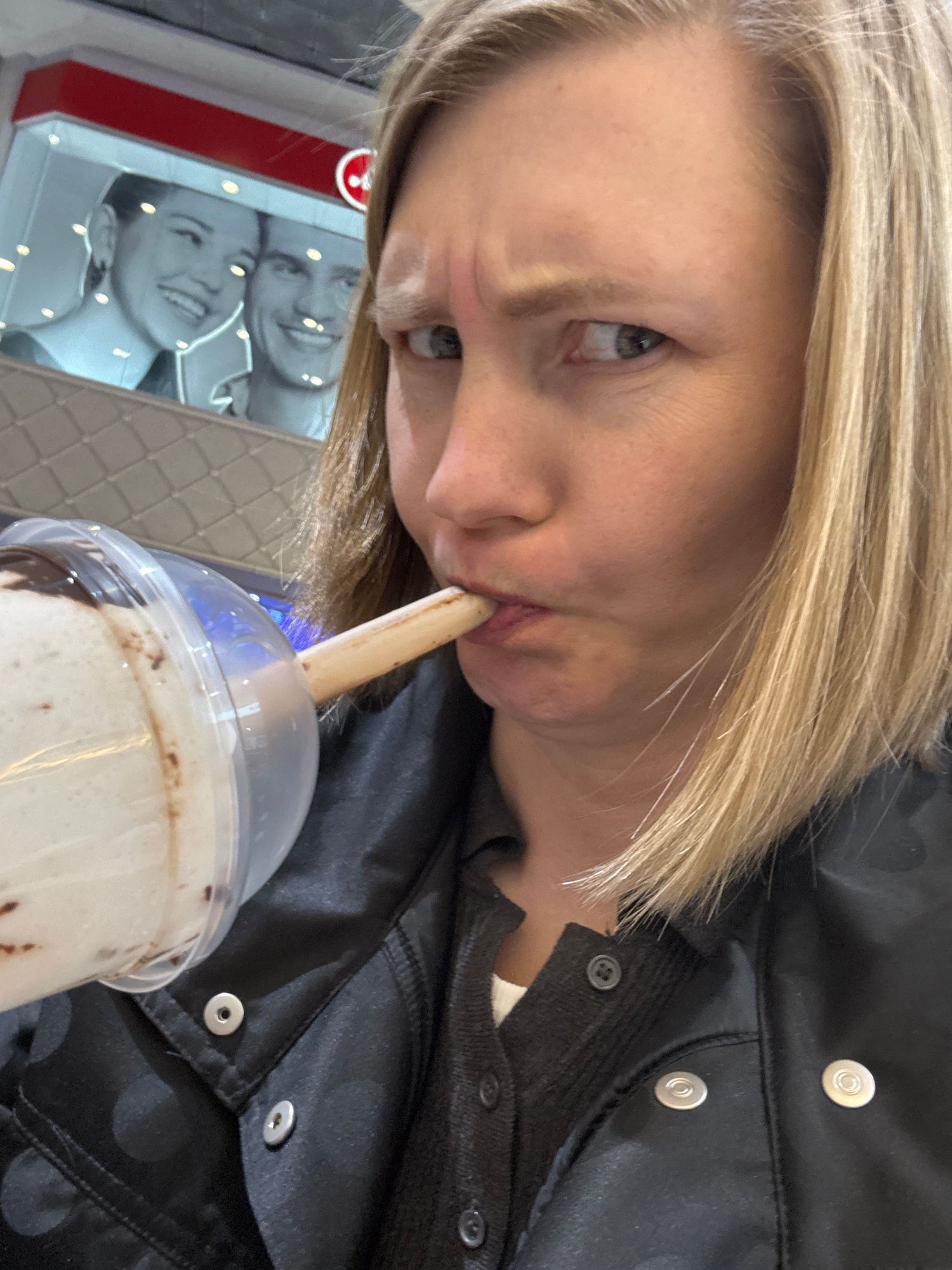 A woman with light blonde hair is drinking a chocolate milkshake through a straw. She is wearing a black jacket with snap closures. In the background, partially visible, is an advertisement or poster…read more