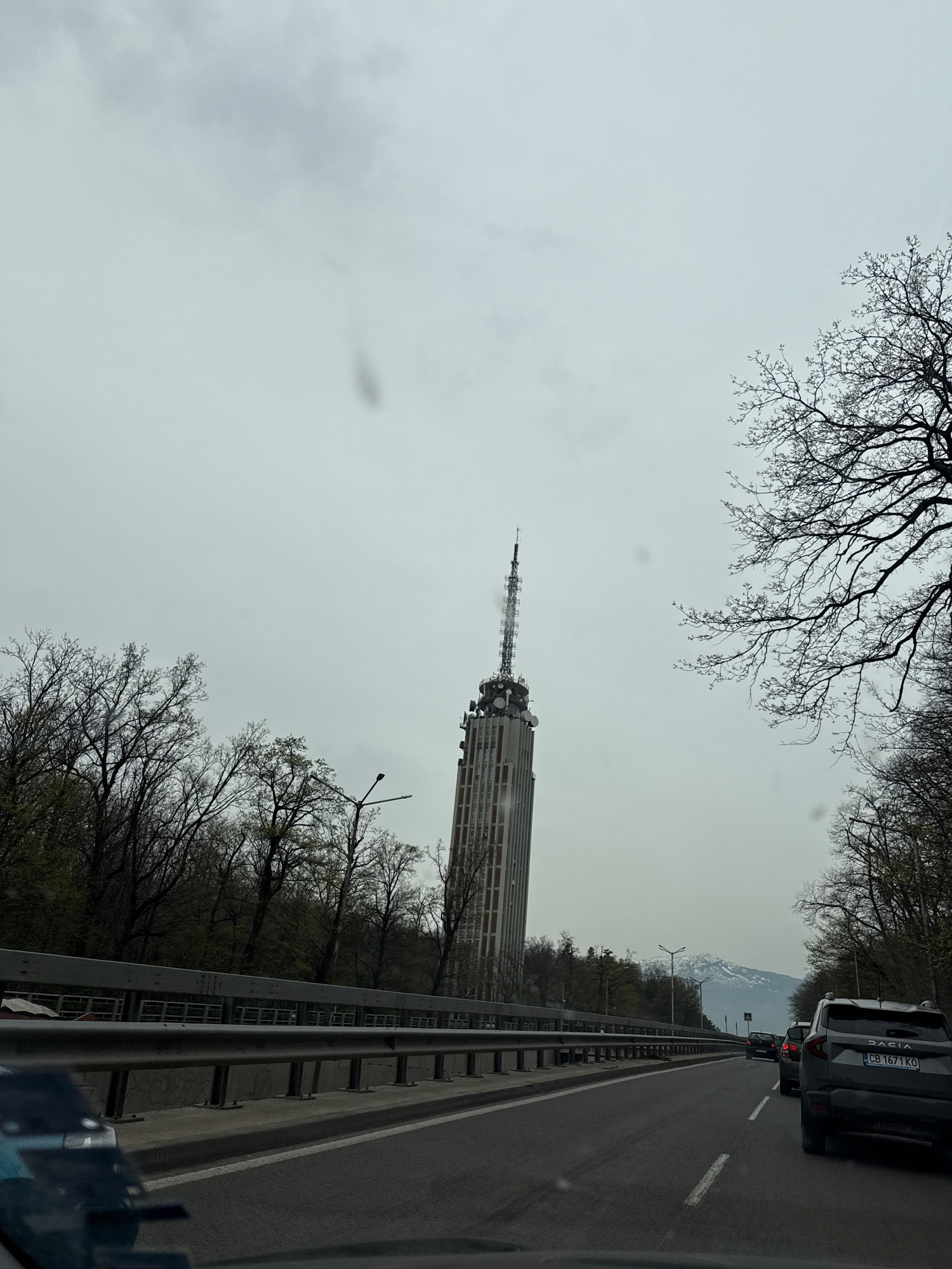 The image shows a view from a car driving on a highway towards the TV tower in Sofia, Bulgaria. The tower, topped with antennae, is situated in the middle distance, with bare trees in the foreground.…read more