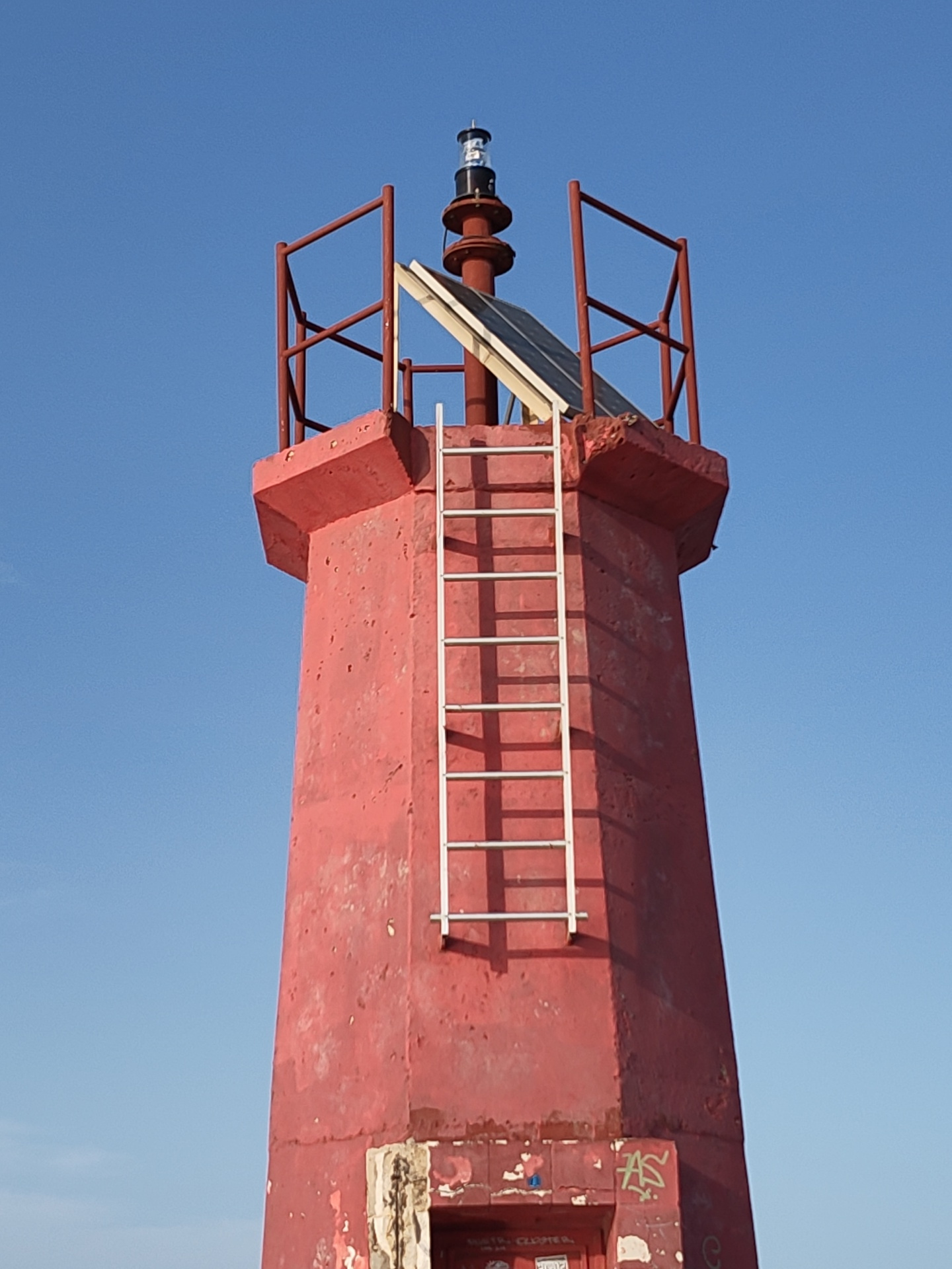The image shows a red lighthouse tower in Dénia, Spain. The tower is constructed of concrete and has a pyramidal shape with a wider base tapering upwards. A white metal ladder is affixed to one side o…read more