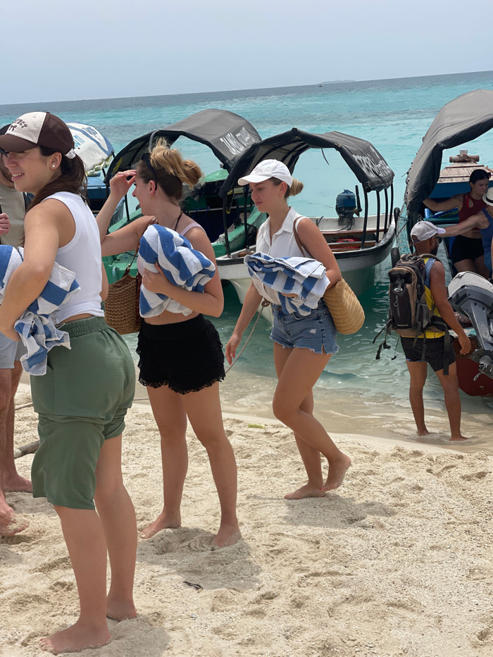 The image depicts a beach scene in Zanzibar, Tanzania, on a bright day. Several individuals are present on a sandy shore and in clear, shallow turquoise water, alongside multiple small boats. In theβ¦read more