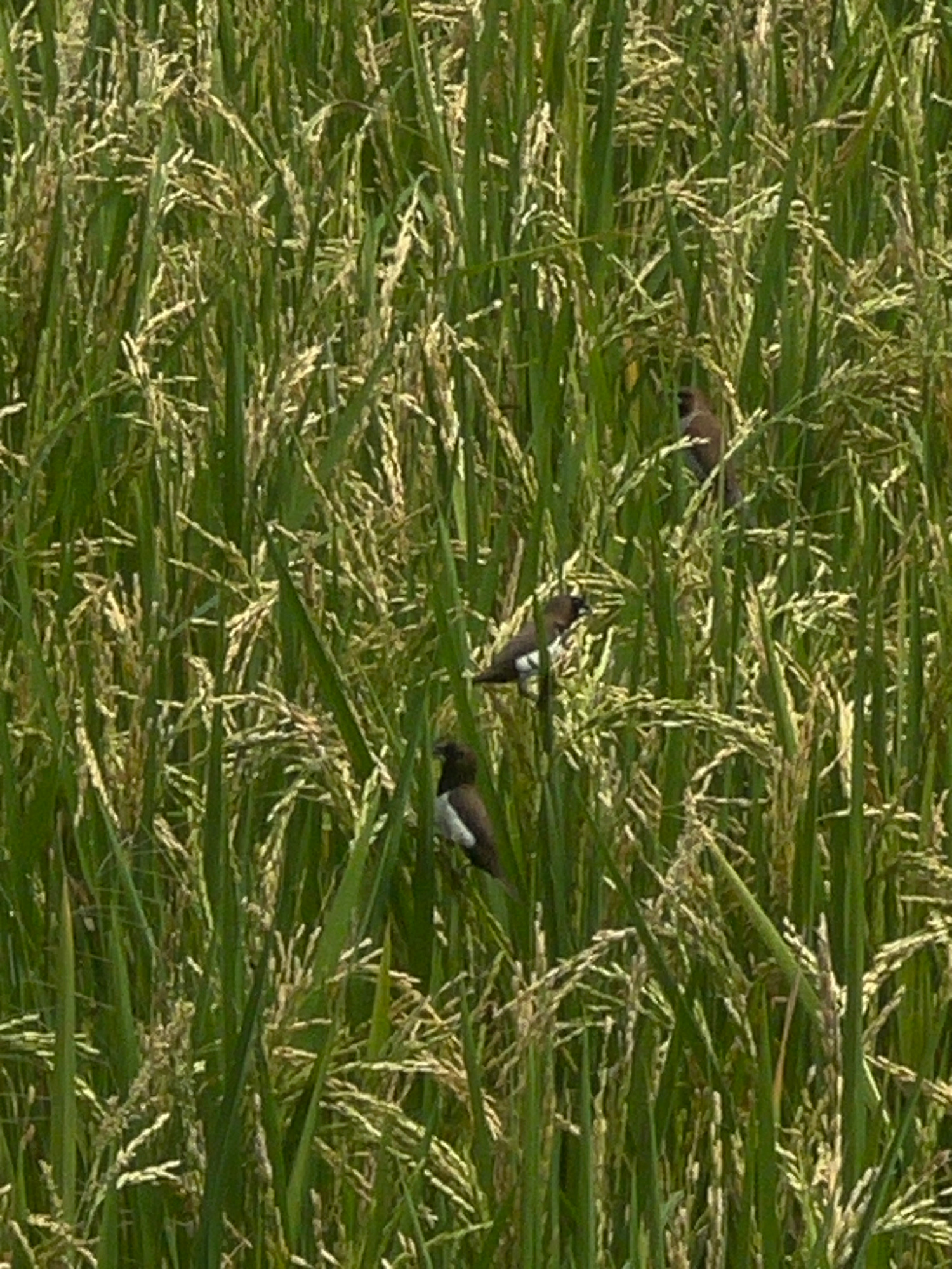 The image shows a dense field of rice stalks, likely in a rural area. Several small birds with dark heads and white chests are visible perched amongst the stalks. The location is probably Canggu, Indo…read more