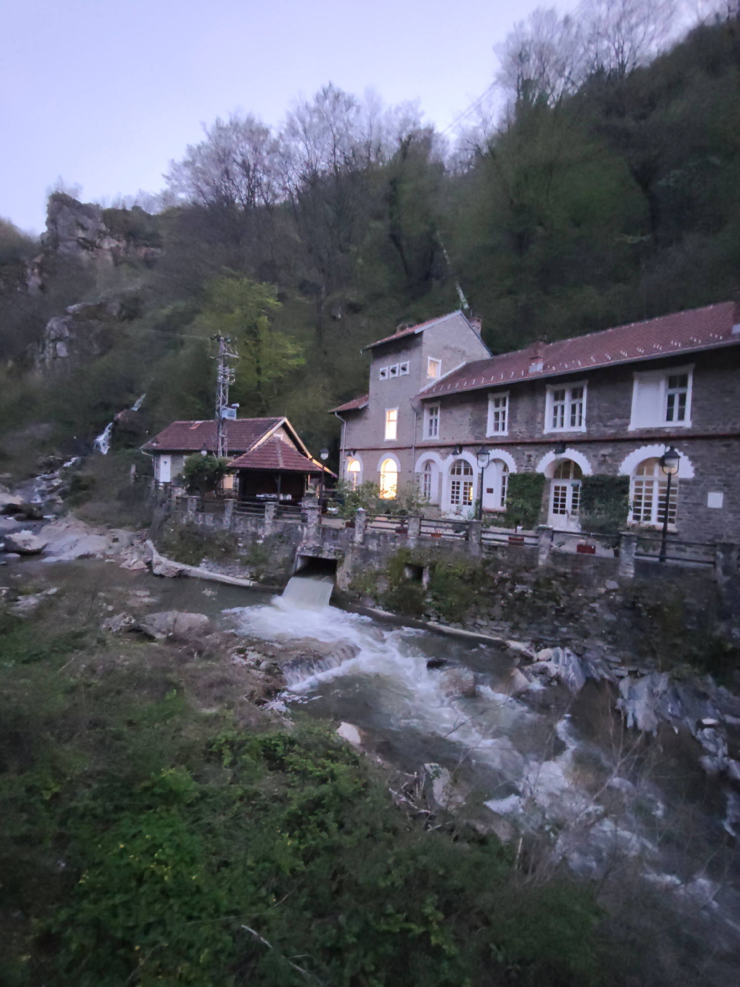 The image shows a building complex near a river or stream, likely at dusk. The main building is a multi-story stone structure with a red-tiled roof and arched windows. A smaller, adjacent building has…read more
