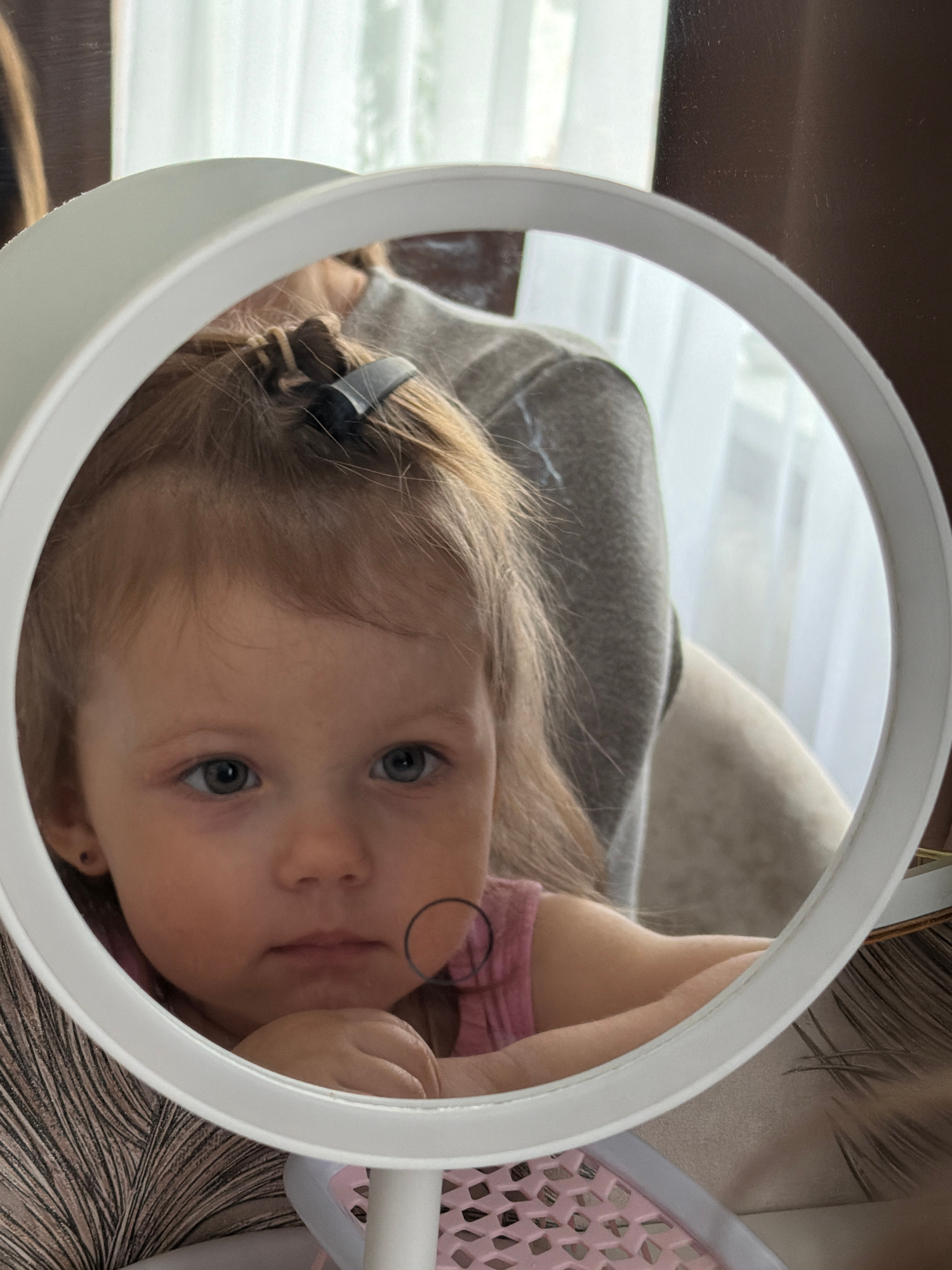 A close-up image shows the reflection of a young child in a round, white-framed mirror or ring light. The child, with light brown hair and prominent blue-gray eyes, gazes directly into the mirror with…read more