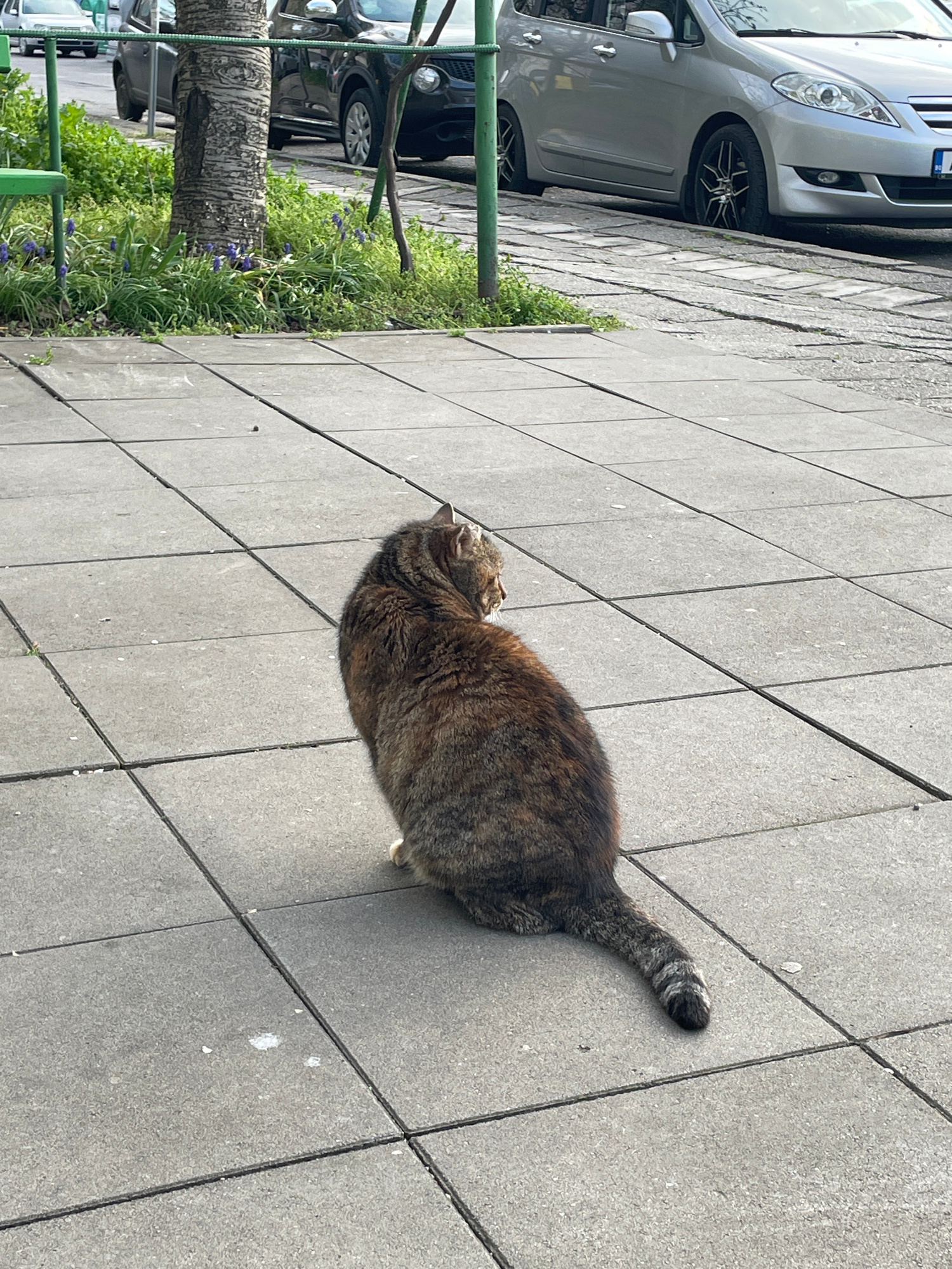 A medium-sized, brown tabby cat is lying on a gray tiled sidewalk, oriented from lower left to upper right. The cat's tail, featuring black and white stripes, is visible on the upper right. The cat is…read more