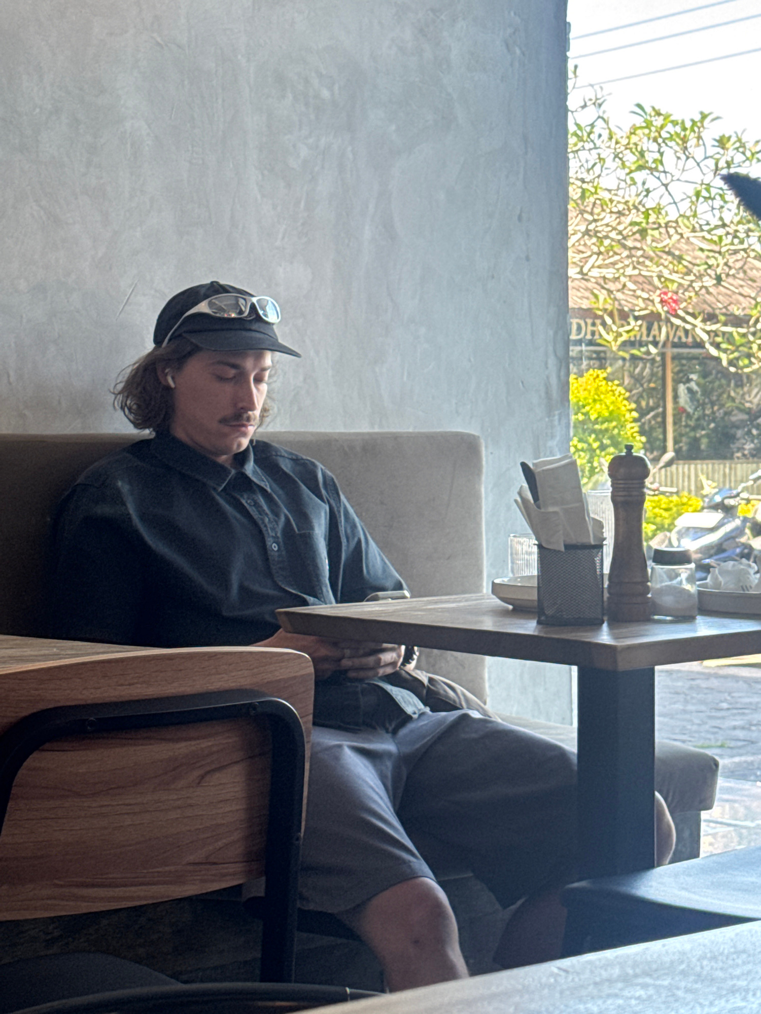 A man wearing a black baseball cap with goggles on the brim is sleeping at a table in an indoor cafe. The table has a pepper shaker, napkins, and glassware on it. The background shows a window with tr…read more