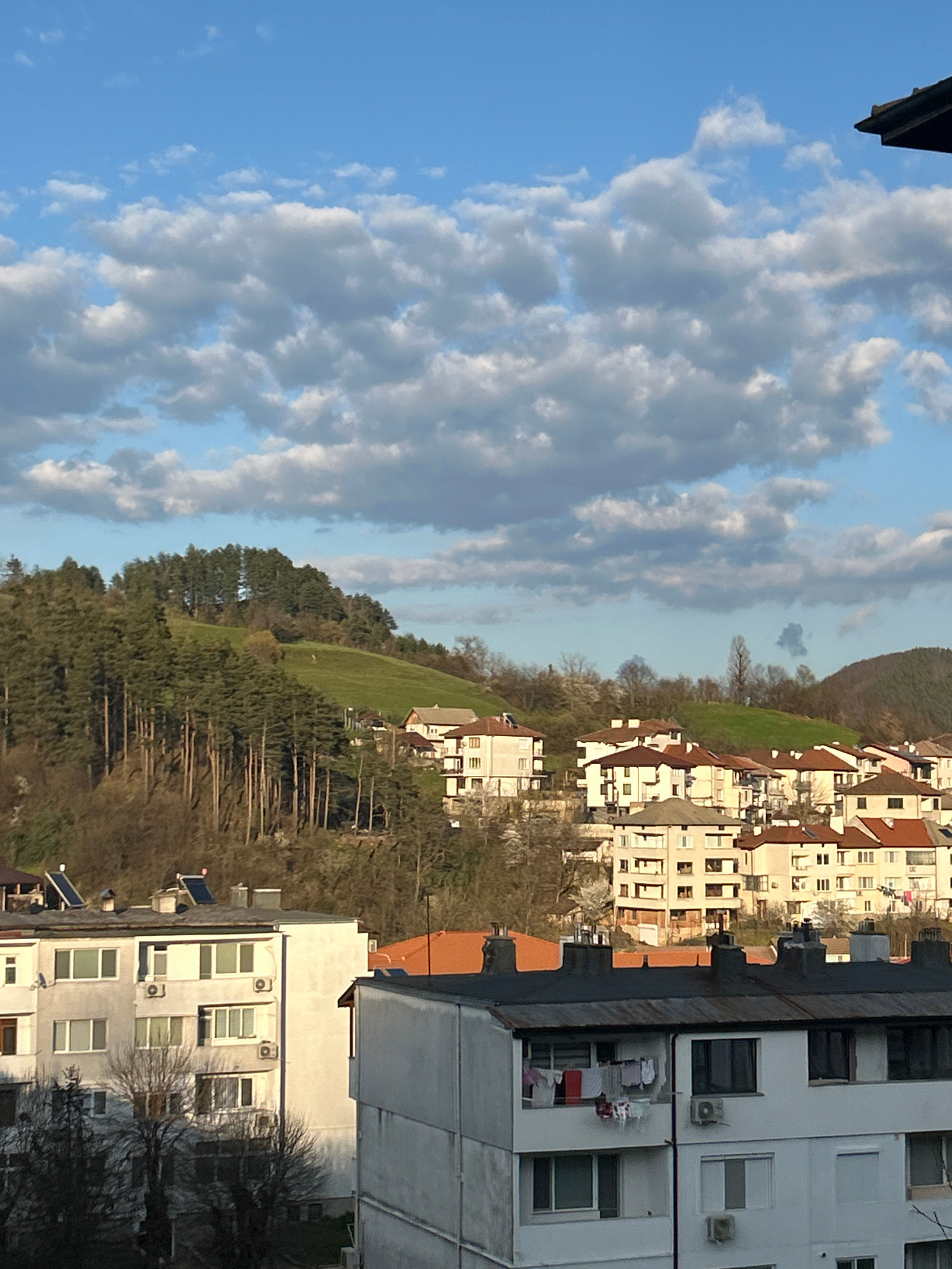 The image is a slightly angled aerial view of a residential area in Zlatograd, Bulgaria. On the right side are several multi-story residential buildings with white and light-colored facades. Some have…read more