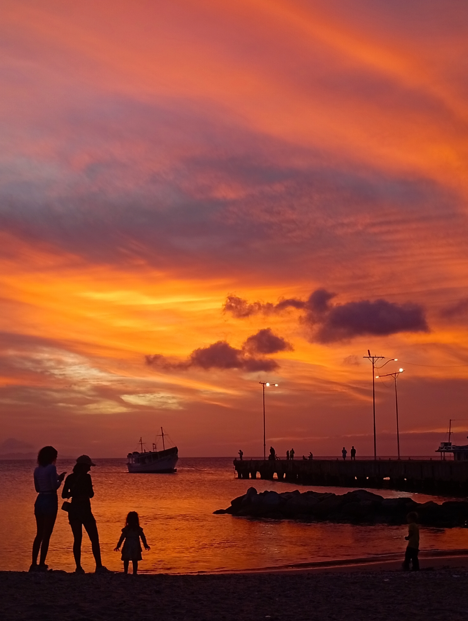 The scene depicts a coastal area in Juan Griego, Venezuela, at dusk. The sky displays a vibrant sunset, characterized by prominent orange and red hues at the horizon, transitioning upwards into purpli…read more