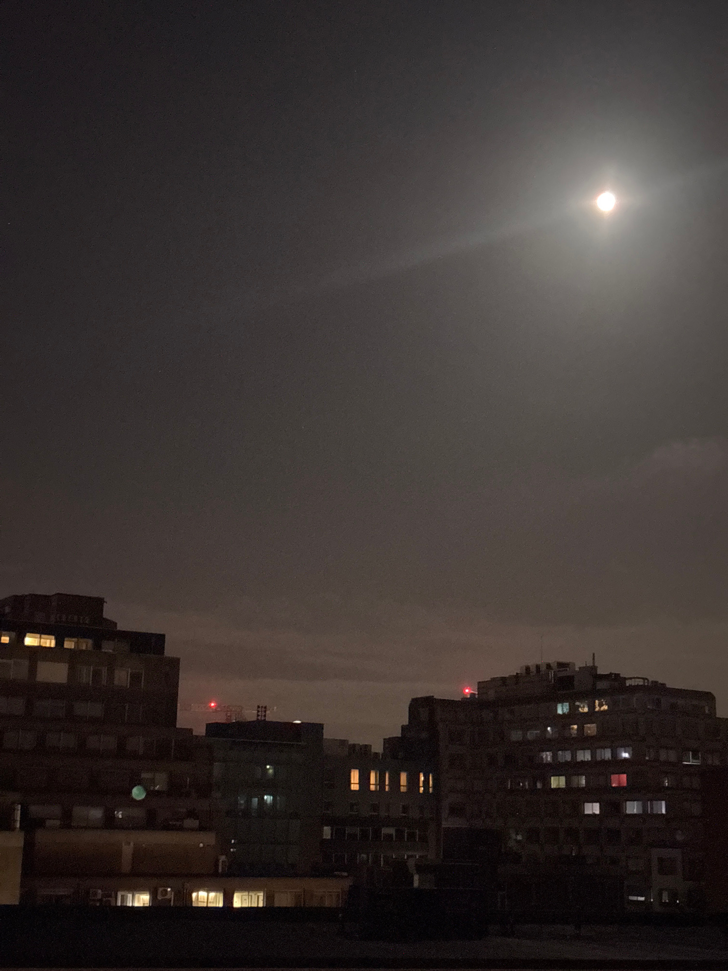 The image depicts a night scene in a city, featuring a bright full moon in the upper left corner. The right side of the frame shows several tall, dark buildings with lighted windows. Some of these bui…read more
