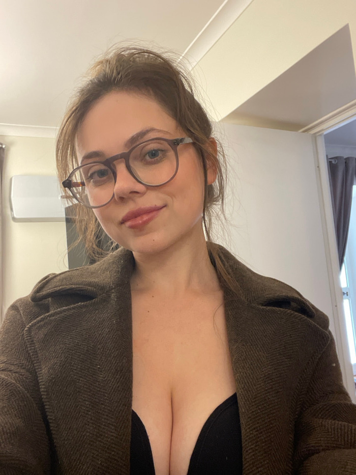 A female subject is depicted in a close-up, head-and-torso shot, presumably a selfie, within an indoor environment. She possesses light brown hair styled in an updo, round-rimmed eyeglasses with dark…read more