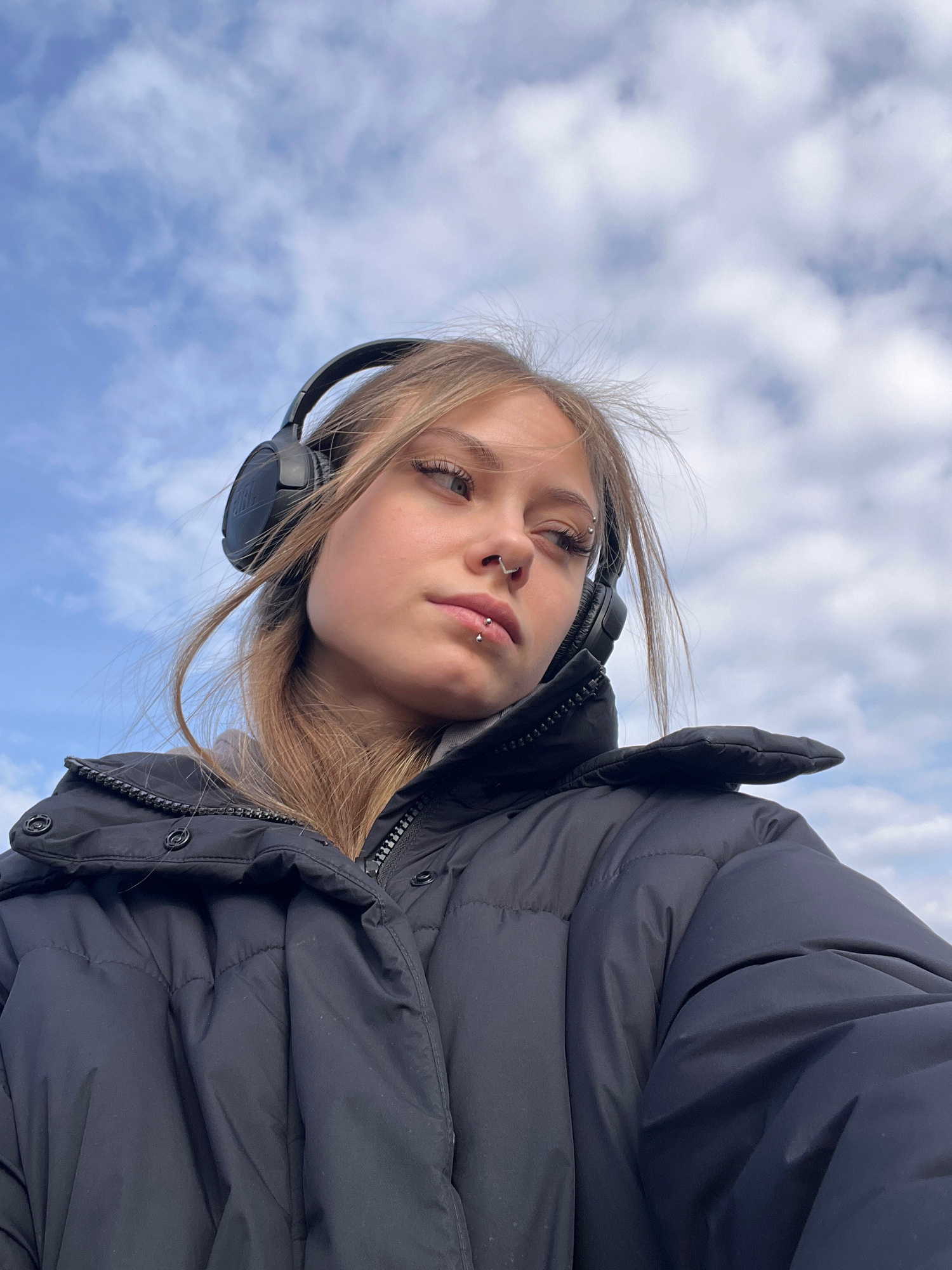 A young woman stands outdoors in Фоки, Russia, under a sky filled with scattered clouds. She wears a black padded jacket with a zipper and buttons. She has headphones around her head. She has blonde h…read more