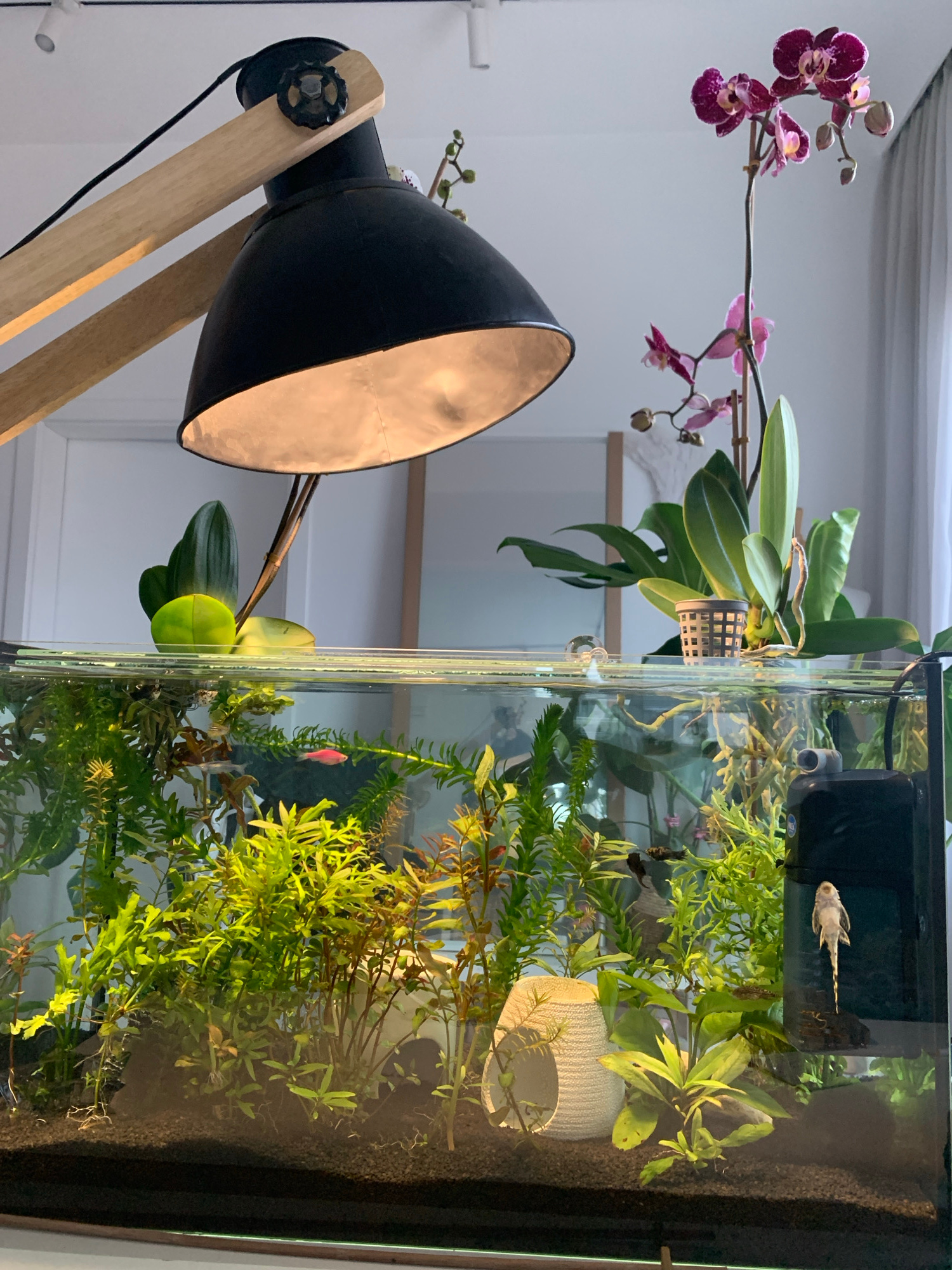 The image shows an indoor scene with a fish tank as the main subject, positioned next to a lamp and orchid. The fish tank contains aquatic plants, fish, and a filtration system visible on the top. The…read more