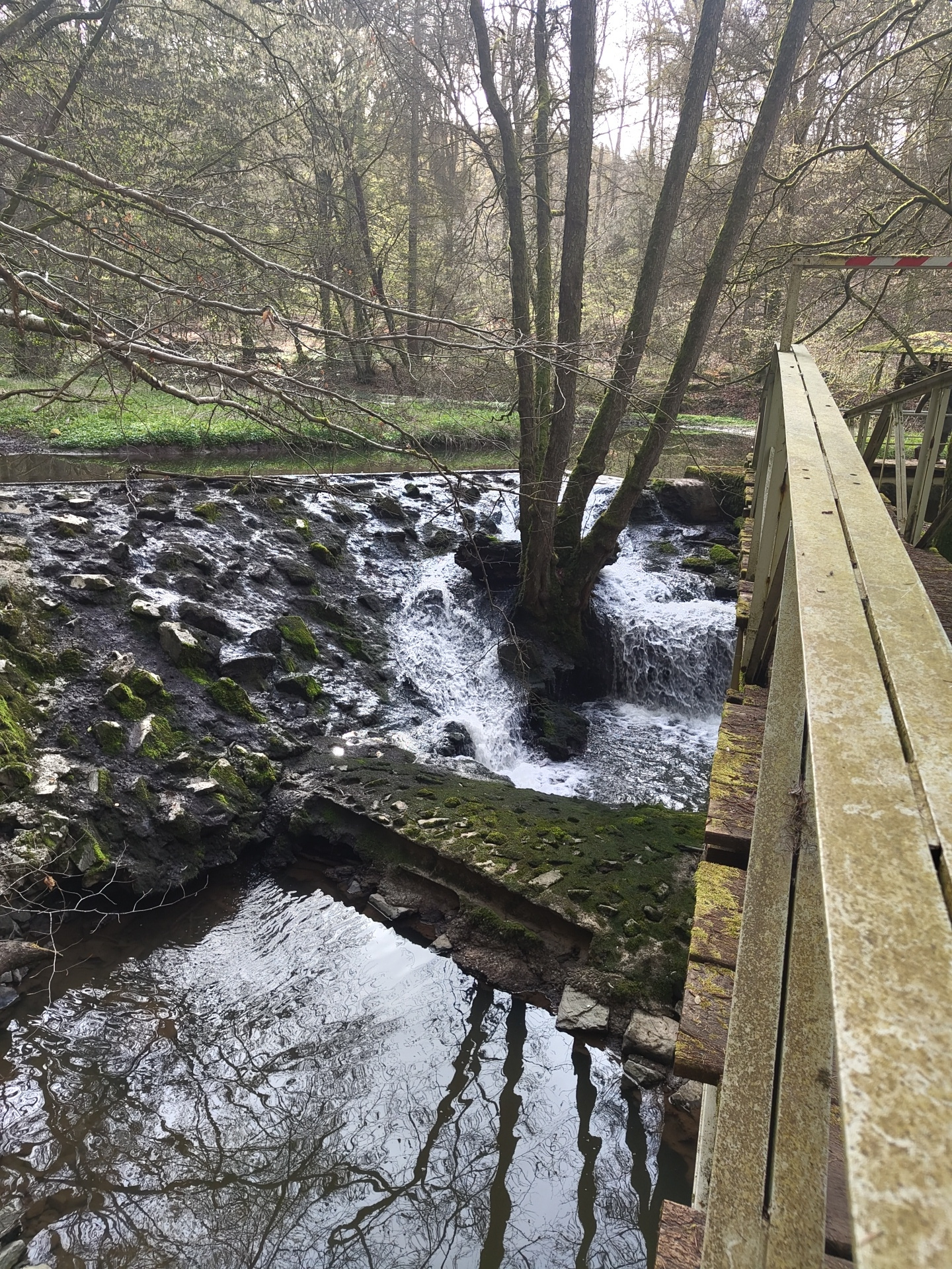 The image shows a waterfall and stream in Mettlach, Germany. The vantage point is from a bridge looking down. The water cascades over rocks and moss-covered surfaces. A small tree grows directly withi…read more