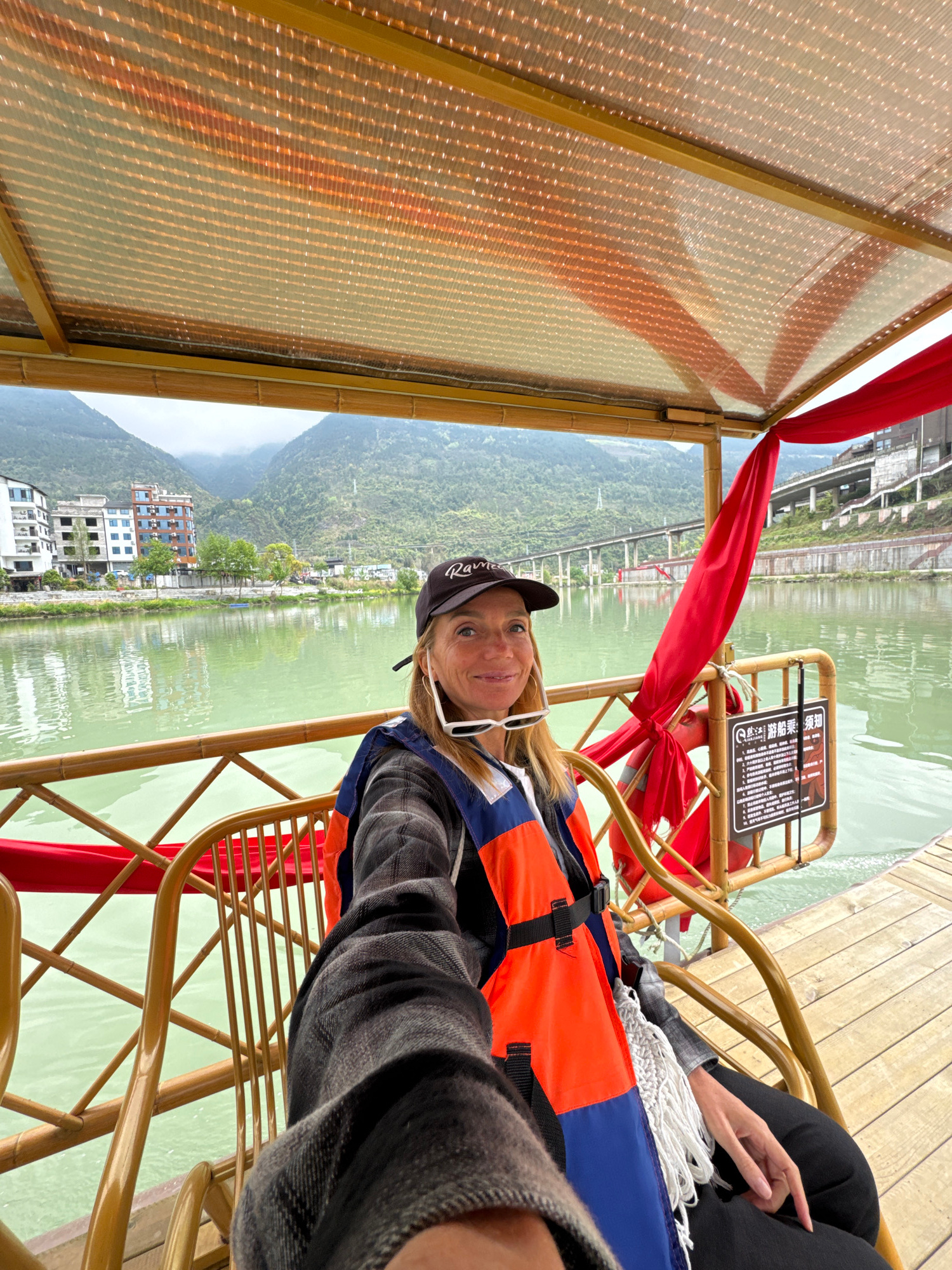 A woman wears a life vest and a baseball cap while seated in a boat on a body of water. The boat has a canopy above and a red decorative fabric. Buildings and a hillside can be seen along the water's…read more