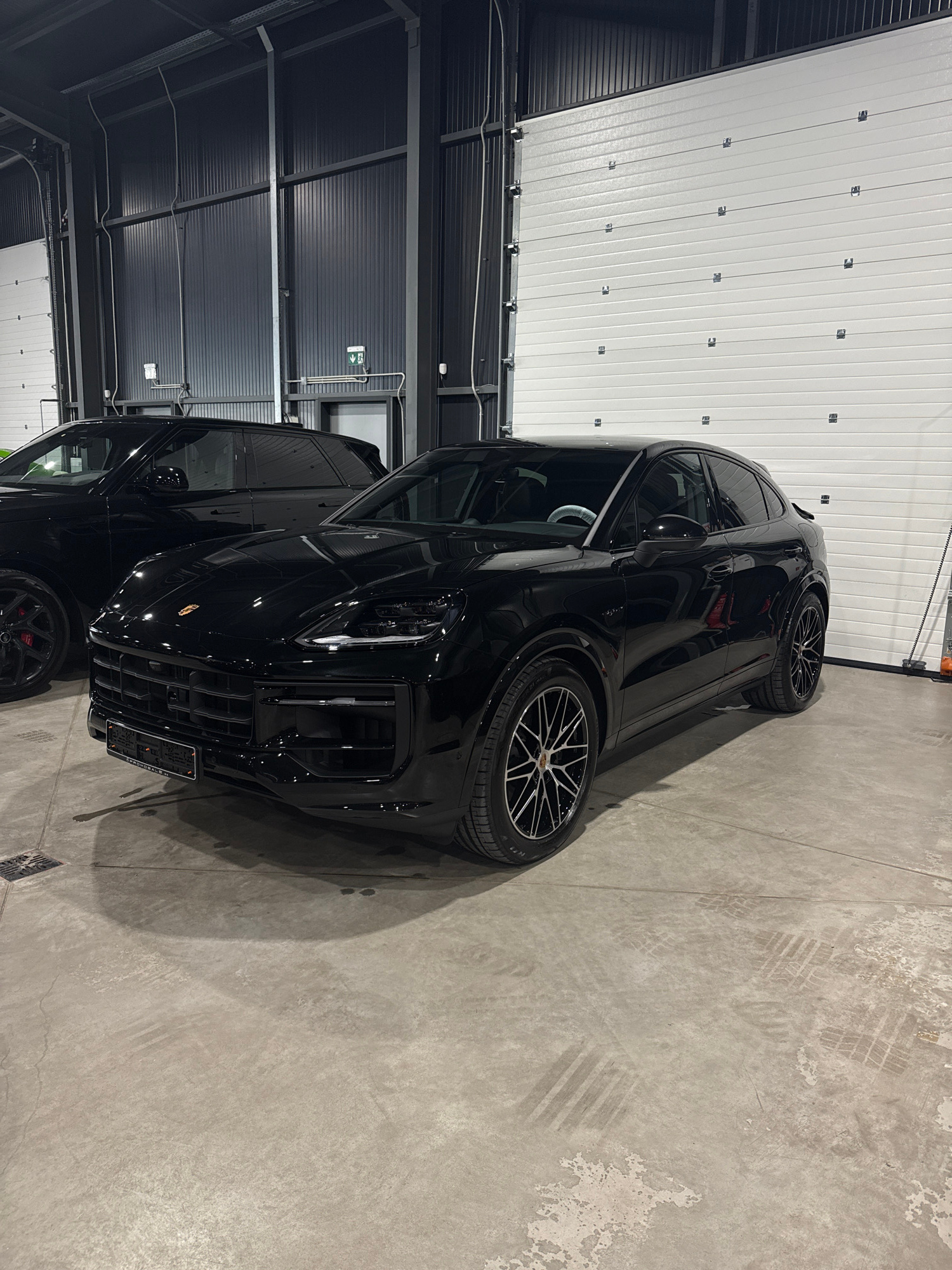 The image displays a highly polished, black Porsche SUV or crossover, resembling a Cayenne Coupe, parked within an indoor industrial setting, likely a garage, workshop, or showroom. The vehicle's imma…read more