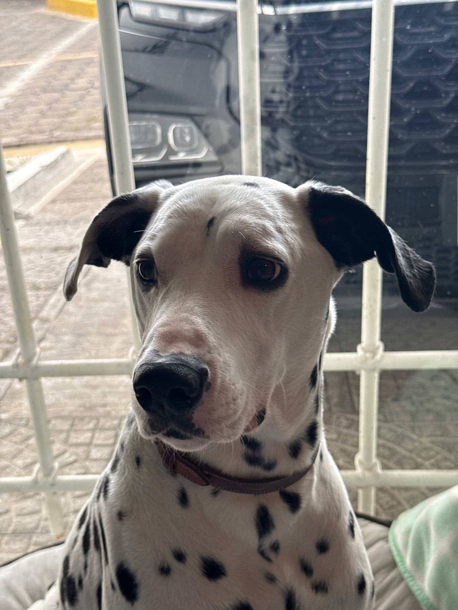 The image shows a Dalmatian dog with black spots on white fur, wearing a brown collar, indoors near a window. Outside the window appears to be a vehicle and some urban features. It is impossible to co…read more