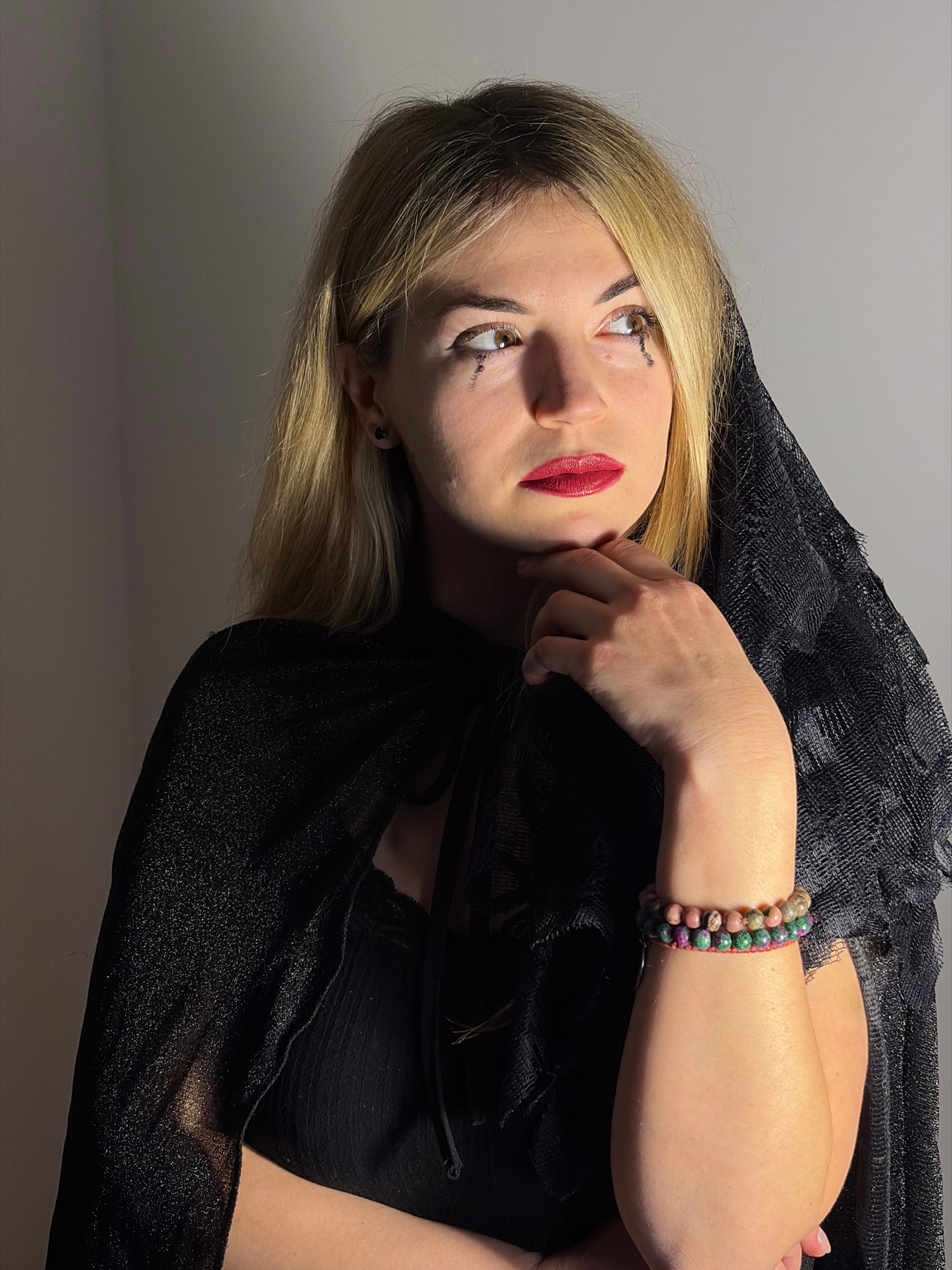 A woman with blond hair is pictured in a dimly lit environment, presumably indoors, as suggested by the plain background. The woman is wearing red lipstick and has dark smudges beneath her eyes. She i…read more