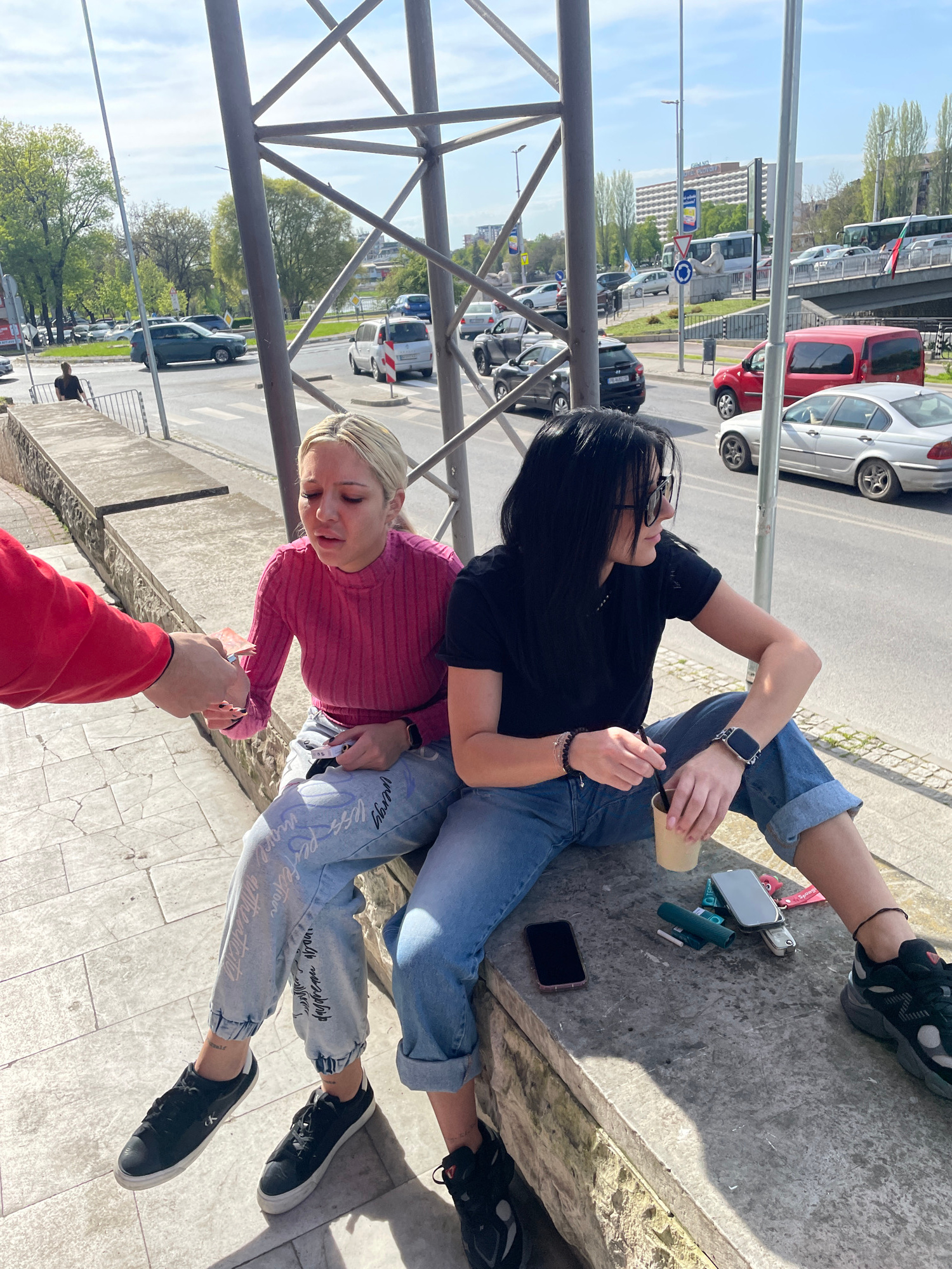 This media file captures an outdoor urban scene in Plovdiv, Bulgaria, on a sunny day. Two young women are seated on a concrete ledge, resting. In the foreground, a person's hand, wearing a red long-sl…read more