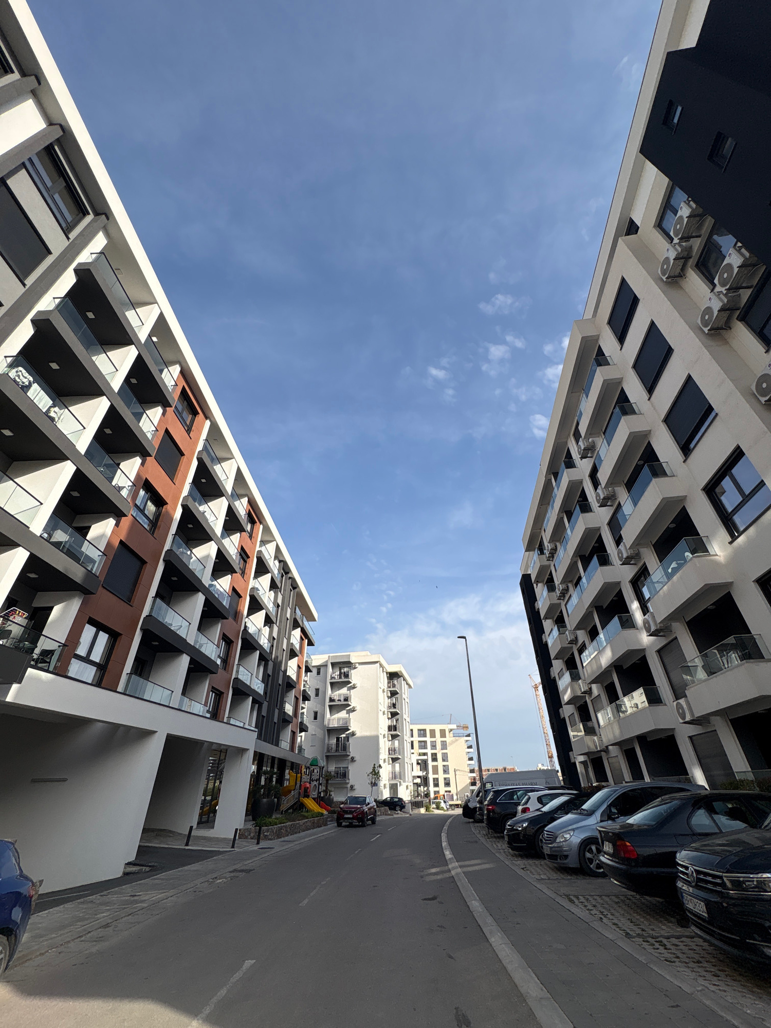 The image depicts a street view in Bar, Montenegro, taken from a low angle looking upwards. Two modern apartment buildings flank the street, creating a narrow corridor of sky. The building on the left…read more