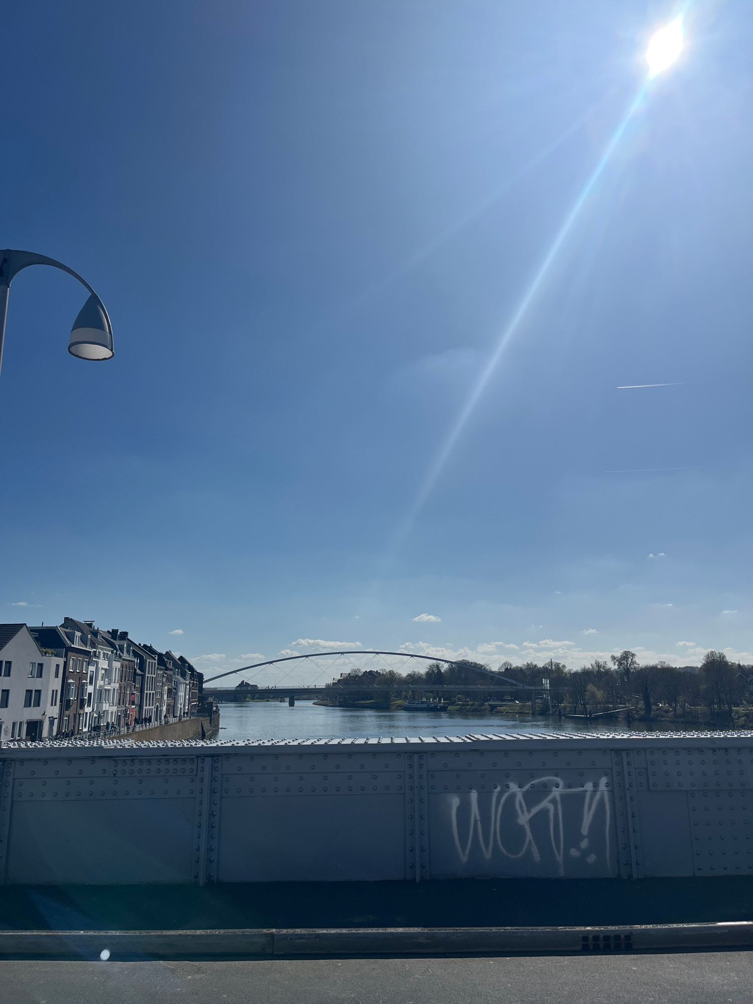 The image shows a view from the Sint Servaasbrug in Maastricht, Netherlands, facing south toward the Sint Servaasbrug and the Maas river. The sky is clear with a bright sun and some vapor trails. Mode…read more
