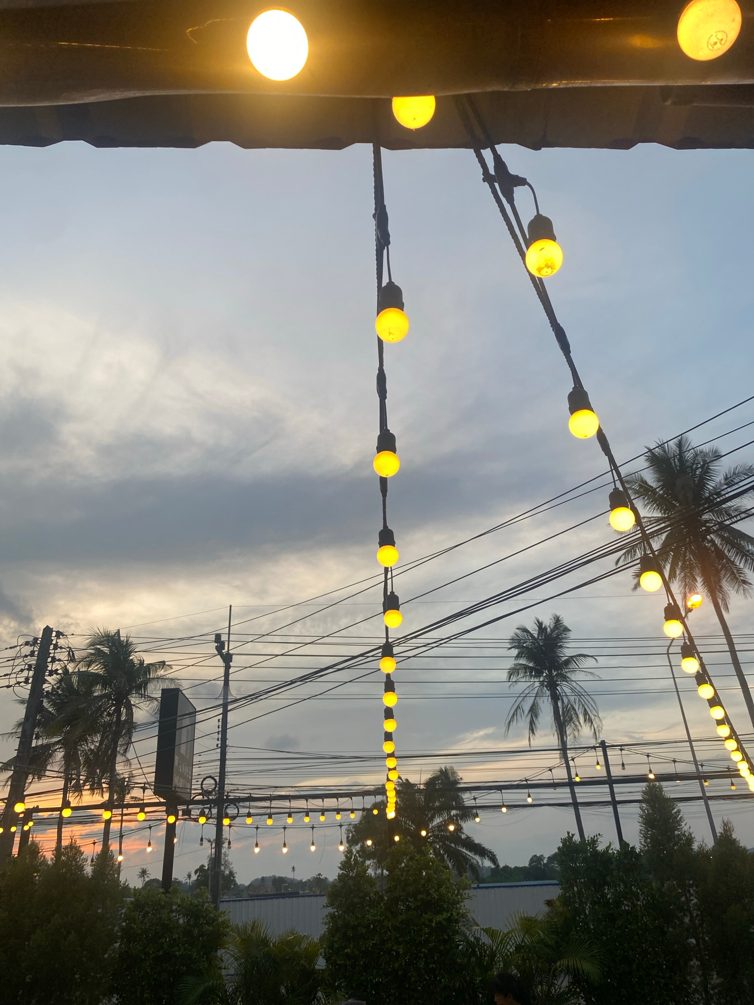 The image, taken in Choeng Thale, Thailand, depicts a low-angle view of string lights suspended above an outdoor space at dusk. The lights are illuminated, casting a warm glow. Palm trees are visible…read more