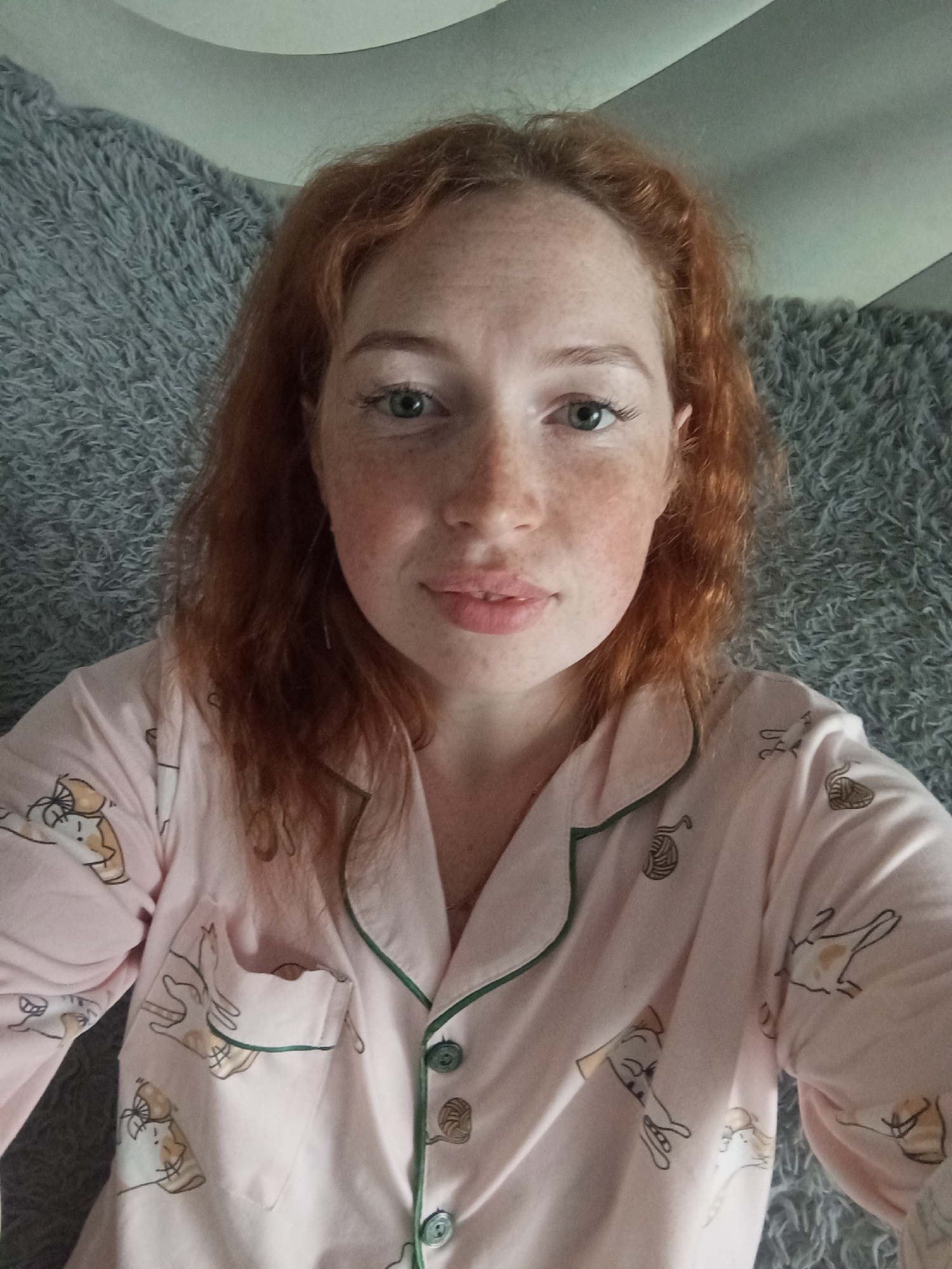 A young woman with red hair and freckles lies on a gray textured surface. She is wearing pink pajamas with a green trim and a pattern of cats and balls of yarn. The scene is indoors. There is no indic…read more