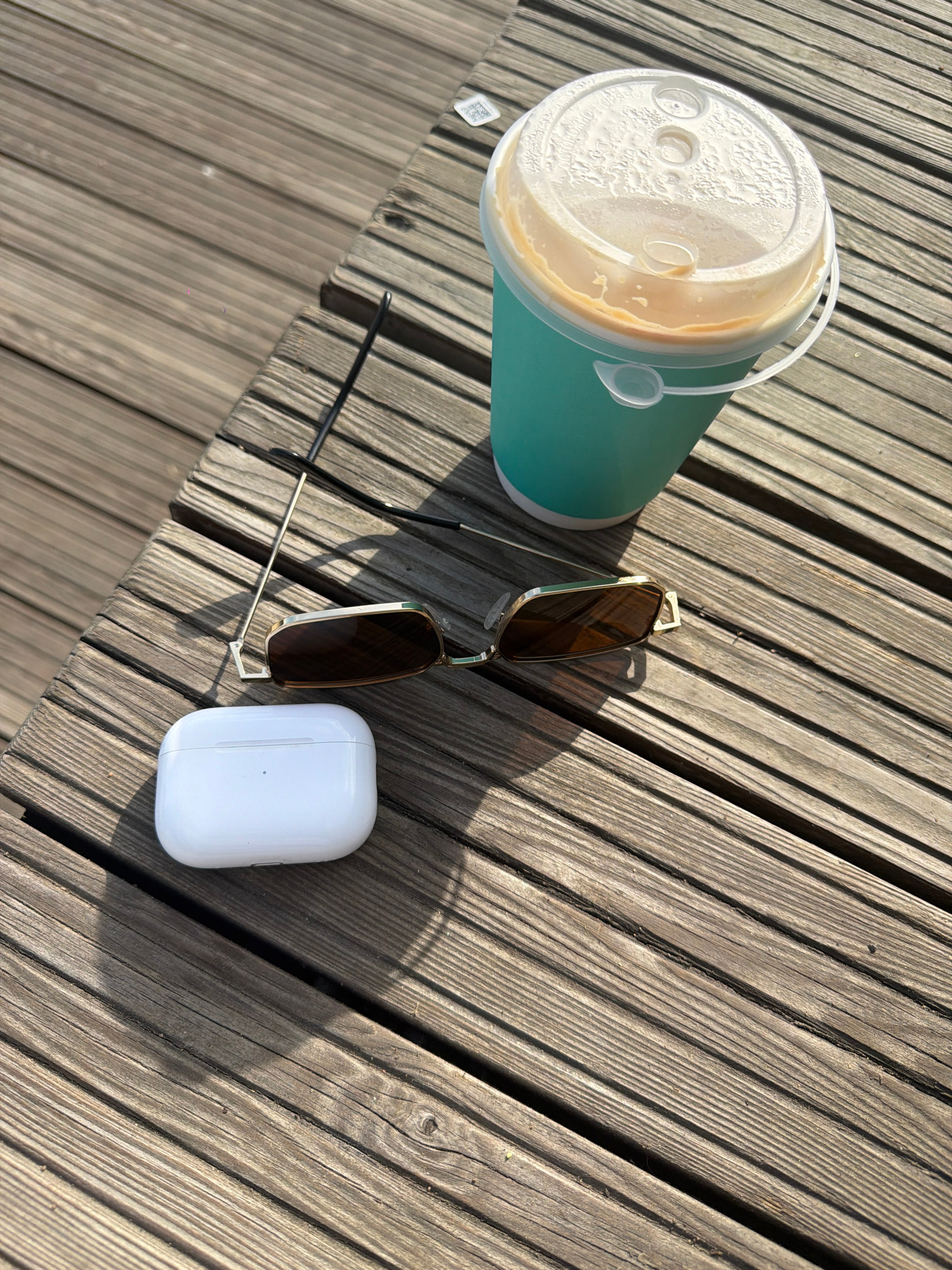 The image shows a still life on a wooden surface, possibly a deck or boardwalk. From left to right, there is a large, clear plastic cup with a green paper sleeve, containing a milky-brown beverage witβ¦read more