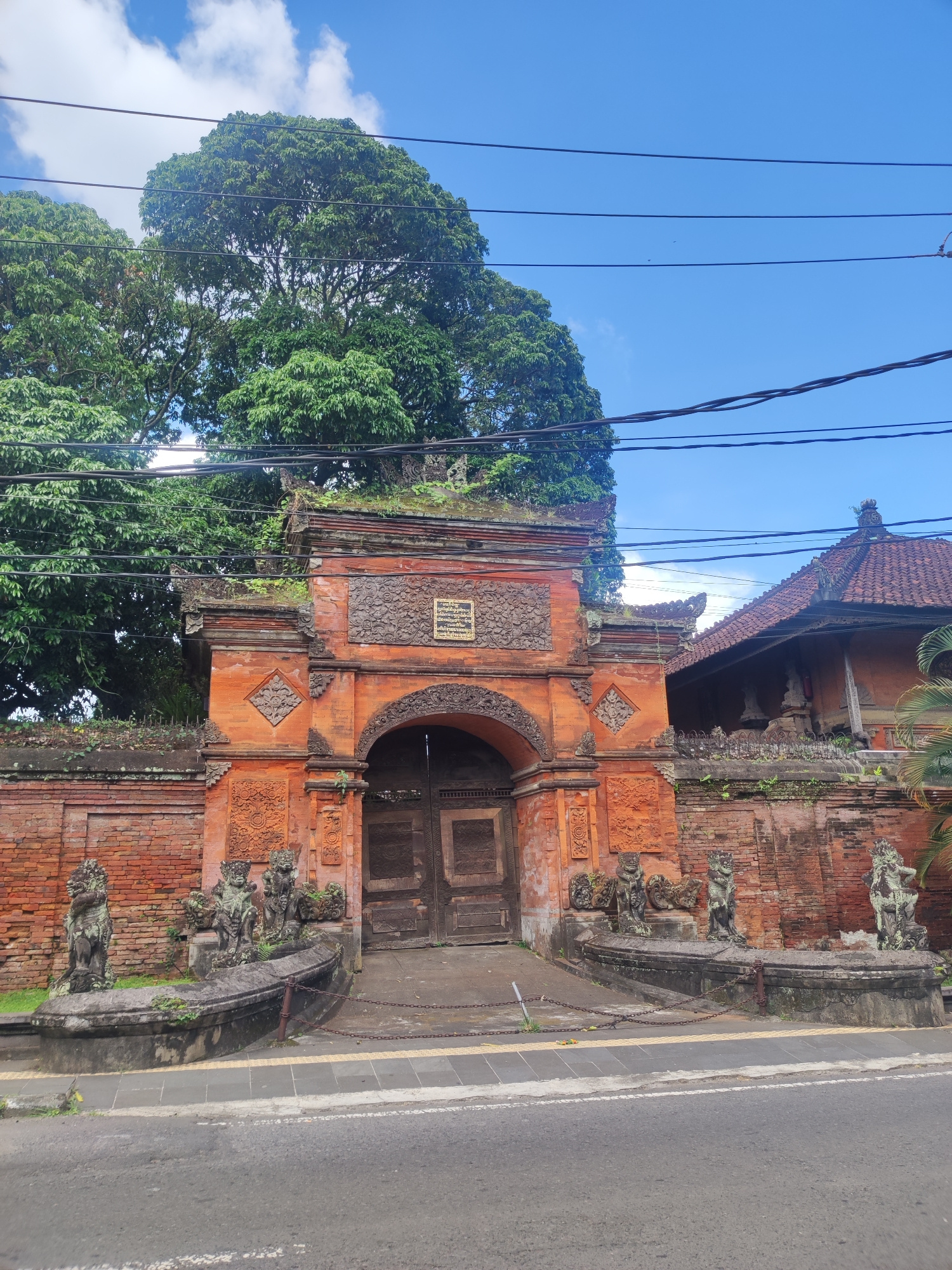 The image shows a traditional Balinese gate in Gianyar, Indonesia. The gate is made of red brick and stone, with intricate carvings and sculptures. There are several statues of mythical creatures flan…read more