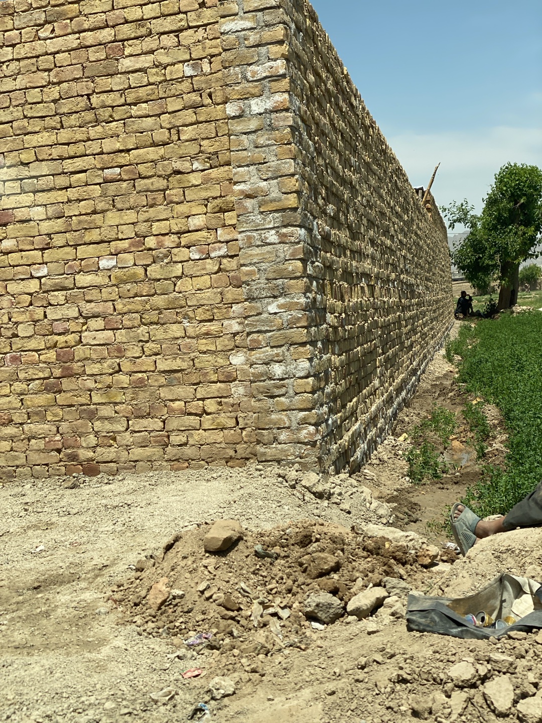 The scene depicts a tall, long brick wall adjacent to a dirt ground in a location that may be Kandahar, Afghanistan. The bricks are yellow-brown and the wall's edge shows signs of whitewash. A mound o…read more