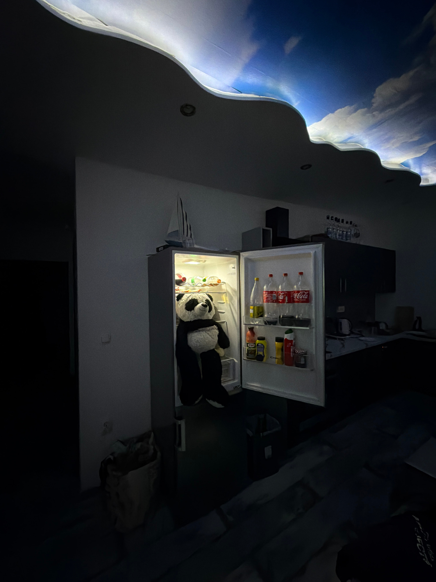 A refrigerated unit stands with its door open, revealing contents including bottled beverages and a plush panda bear. The walls are painted white with some decoration including a cloud-like mural at t…read more