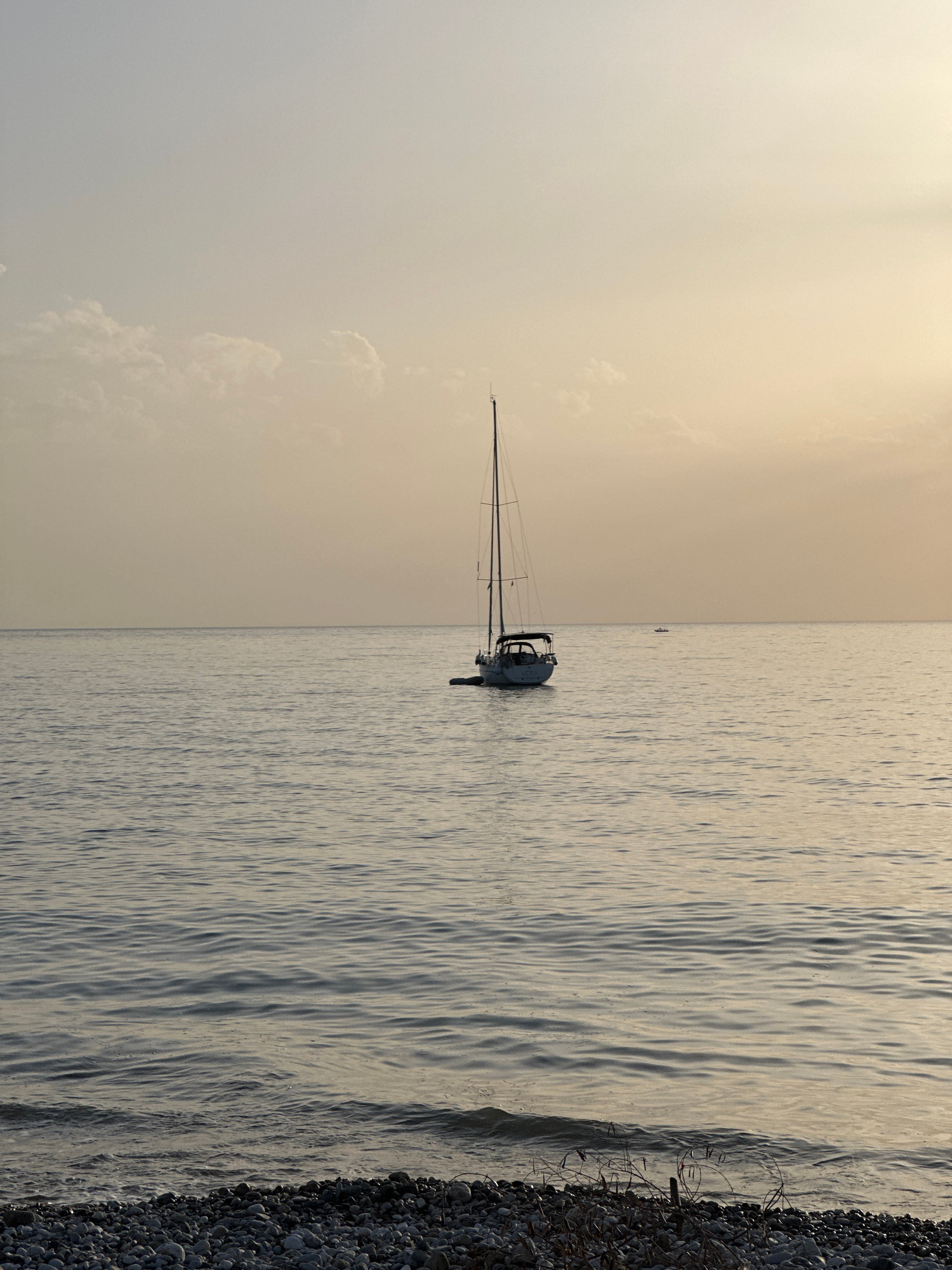 The image shows a sailboat anchored off the coast of Šušanj, Montenegro. The sailboat is white with a dark mast and rigging. The sea is calm with small waves, and the sky is overcast with a light, pal…read more