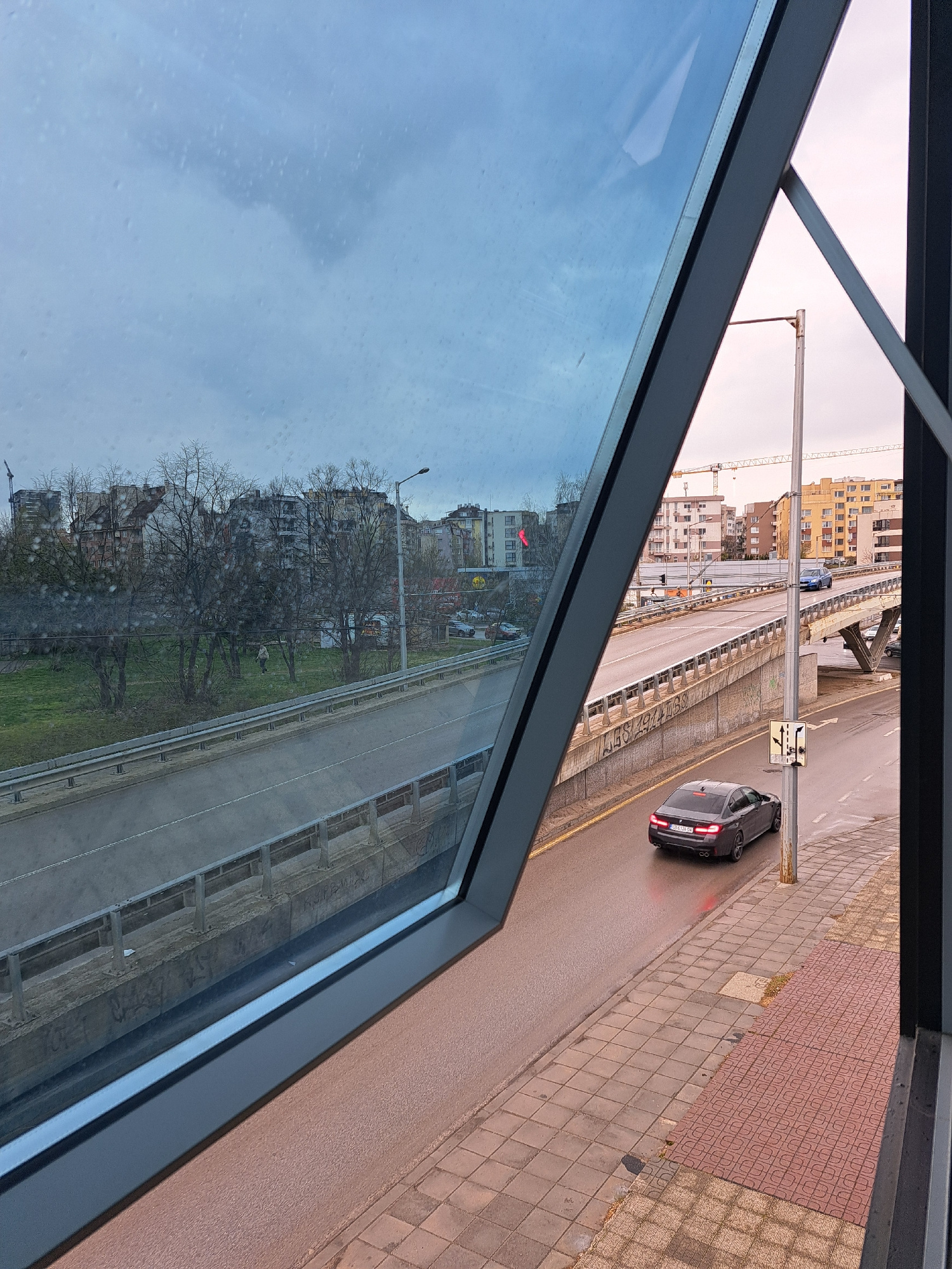 View from a window of a city street with a bridge overhead. A car is driving on the street. The sky is overcast. In the reflection of the window, there are buildings and trees. Location: Unknown, Unkn…read more