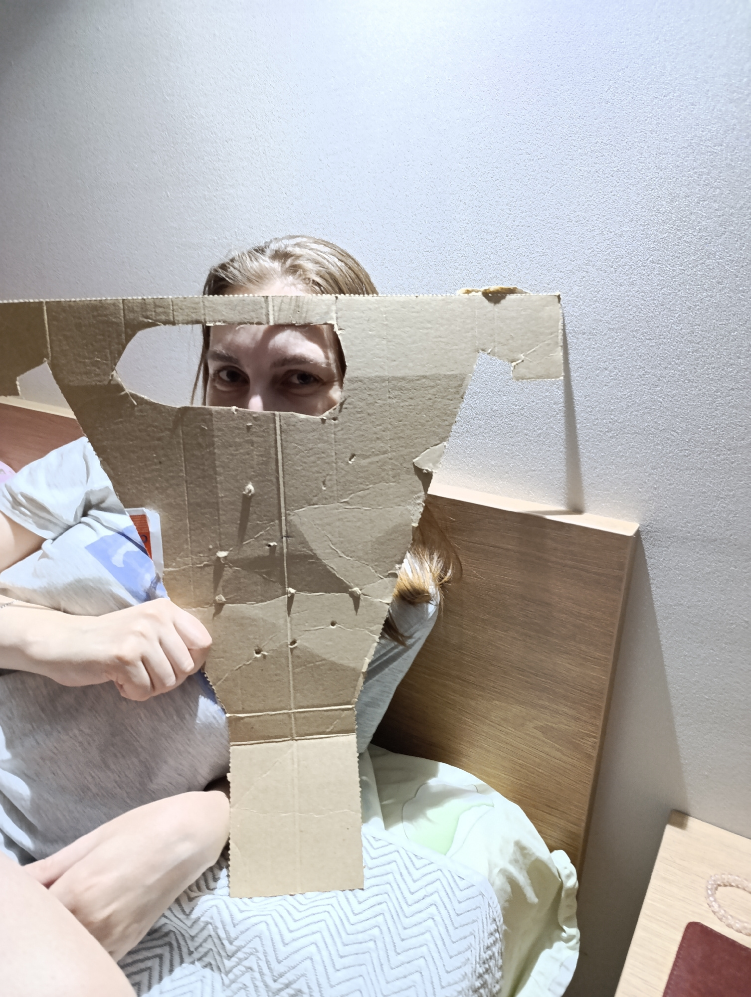 A fair-skinned person with blonde hair is sitting in a bed with a light wood headboard in a room with a light-colored wall. The person is holding a piece of torn, corrugated cardboard in front of thei…read more