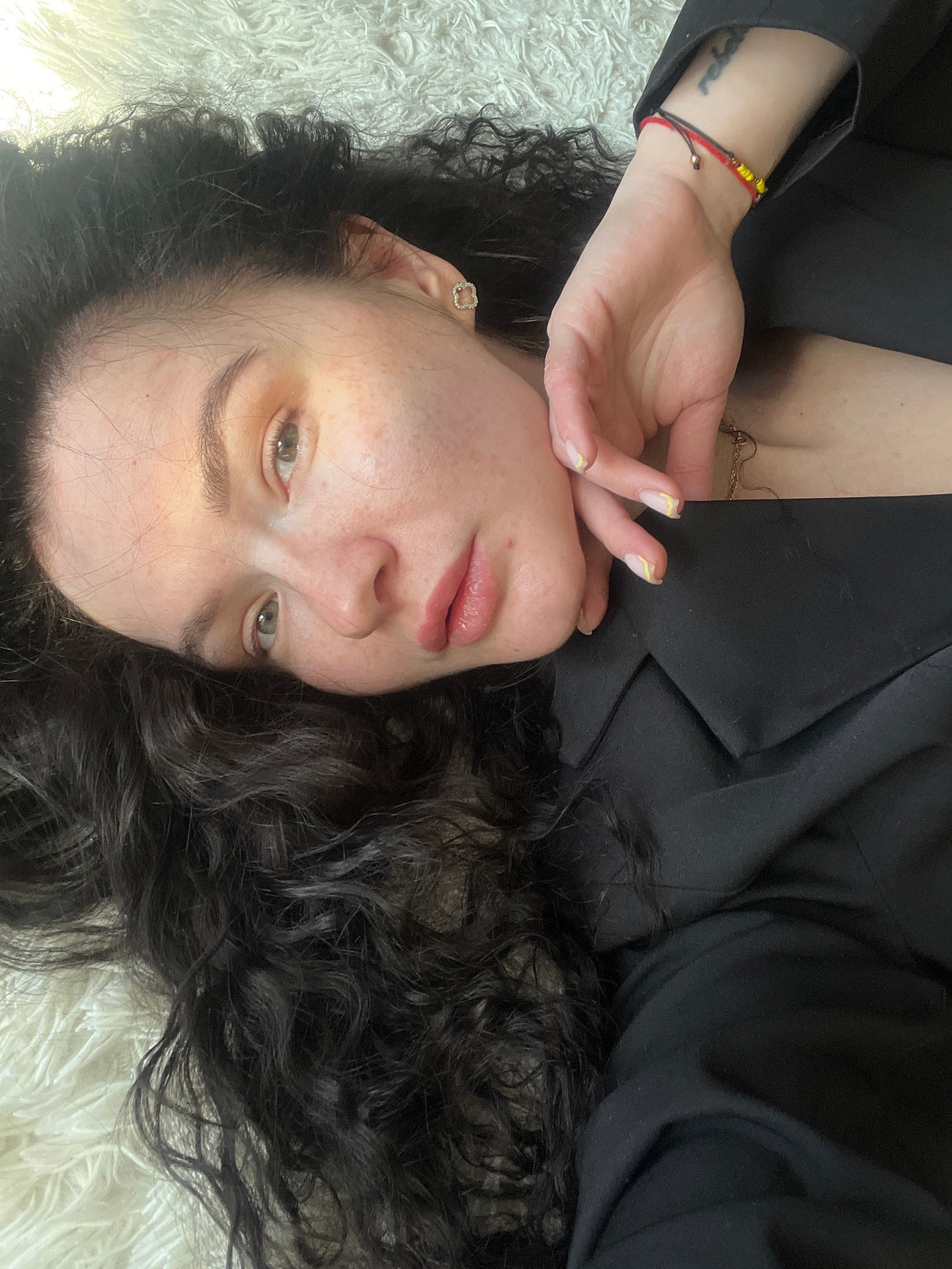A young woman with fair skin, freckles, and dark curly hair lies on a white fluffy surface, possibly a rug. She is wearing a black blazer. Her left hand is near her face. Her nails are painted with a…read more