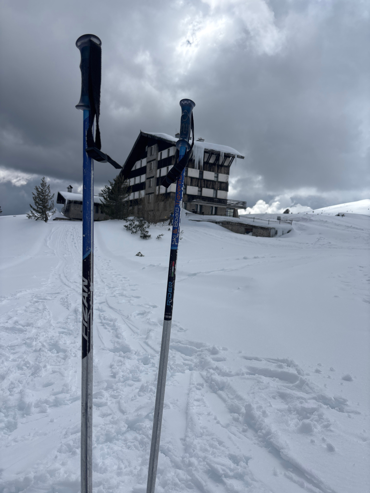 The image captures a snowy scene in an unidentified location in Bulgaria. Two ski poles dominate the foreground, their handles and straps clearly visible. The pole closer to the viewer is black and bl…read more