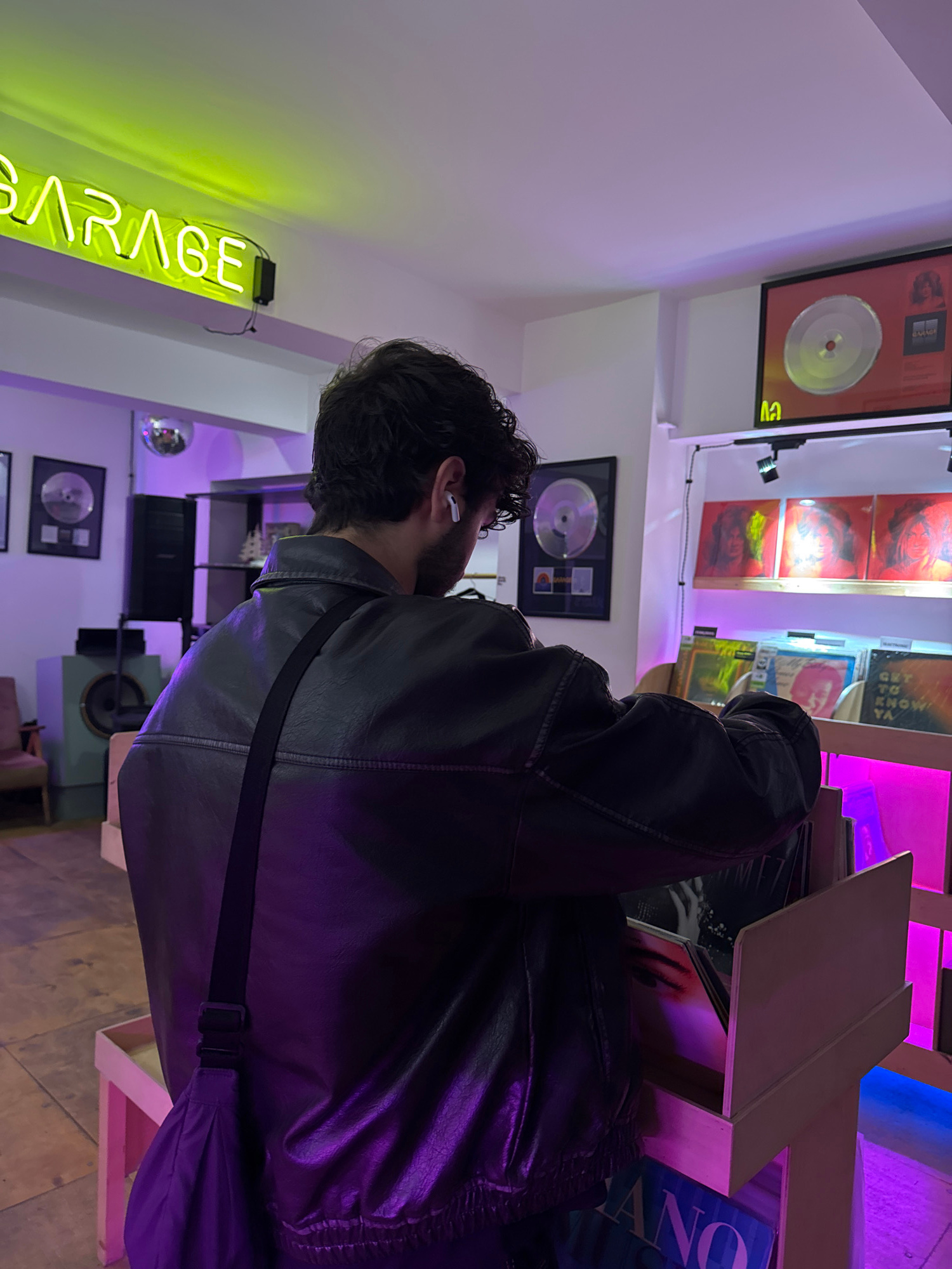 A vertically oriented photograph shows a man wearing a black leather jacket and an earpiece, browsing records at a vinyl record store. The store appears to be in Yerevan, Armenia, based on the "GARAGE…read more