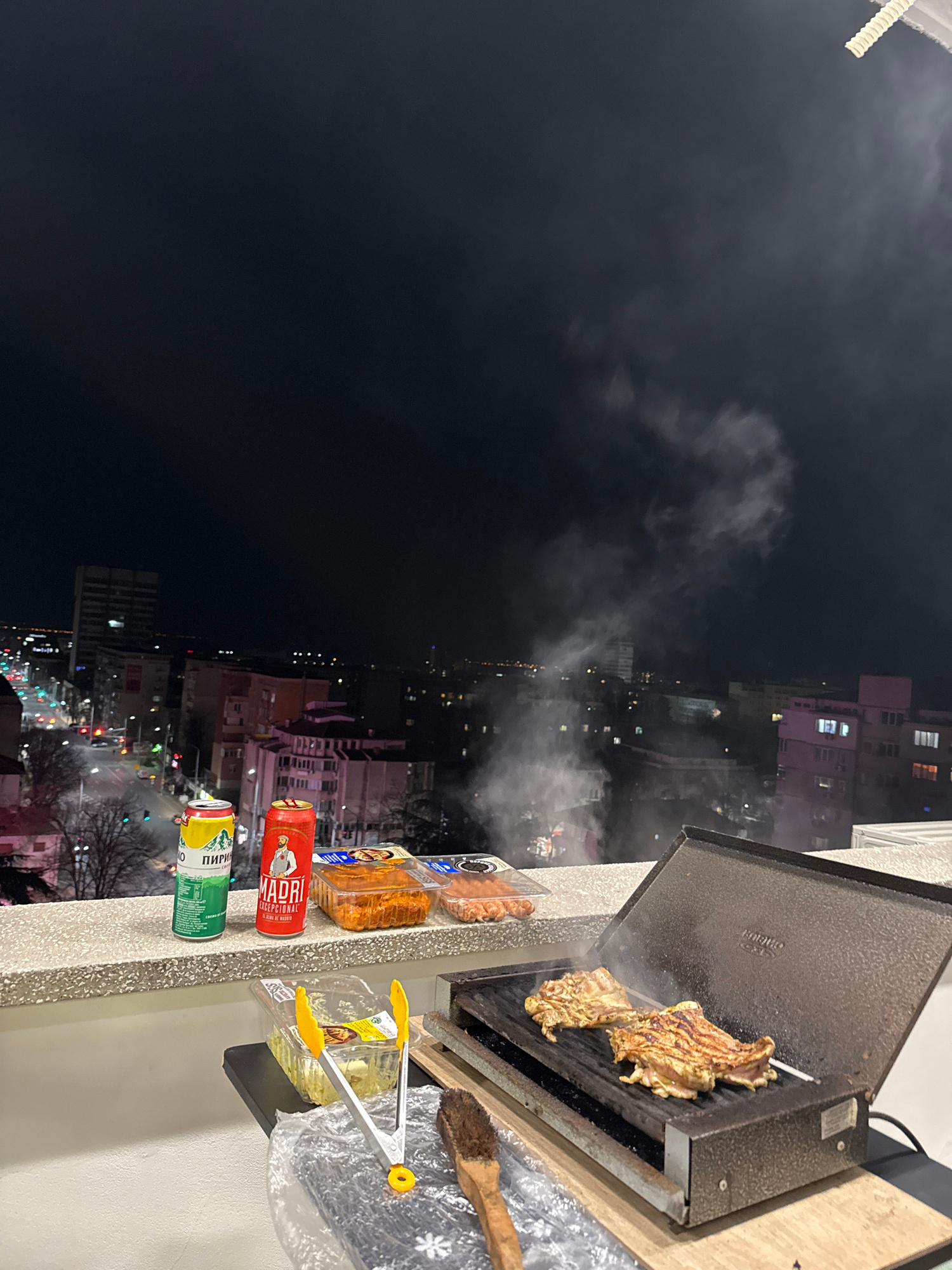 The image shows an outdoor grill with food cooking on it, likely on a balcony at night. A city skyline is visible in the background, with many buildings and lit windows. In the foreground, next to t…read more