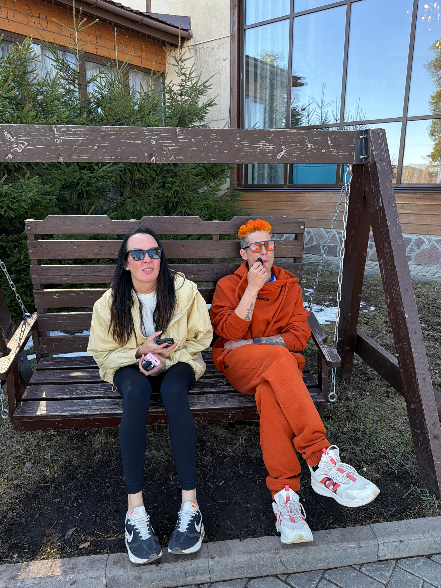 Two individuals, a male and a female, are sitting on a brown wooden swing-bench outdoors. The male, positioned at the top of the frame, has orange hair, is wearing orange clothing, and has tattoos onβ¦read more
